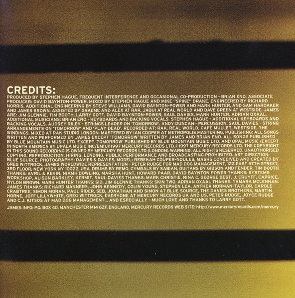 Recorded at: Rak, Real World, Cafe Mullet, Westside, The Windings. Mixed at Rak Studio London. Mastered at Metropolis Mastering.All songs published by Blue Mountain Music Ltd. except track 1 published by Blue Mountain Music Ltd. and Opal Music (except in North America by Upala Music Inc/EMI)On the CD face and back inlay: ℗ 1997 Mercury Records Ltd. © 1997 Mercury Records Ltd. The copyright in this sound recording is owned by Mercury Records Ltd (London)Jewel® case with a transparent tray and a 12-page booklet.