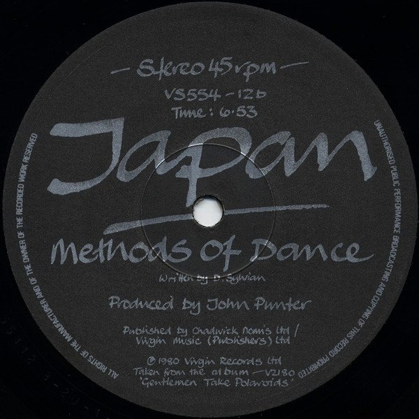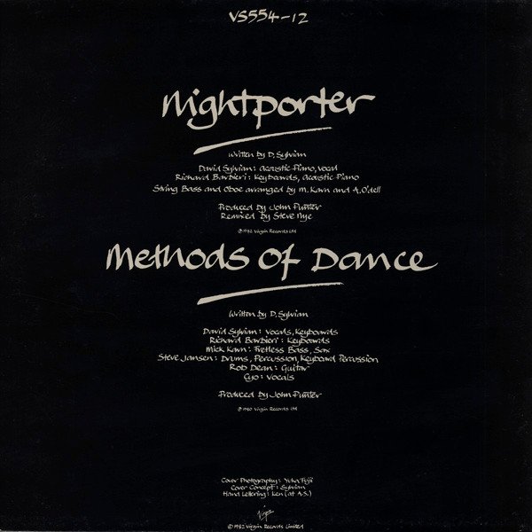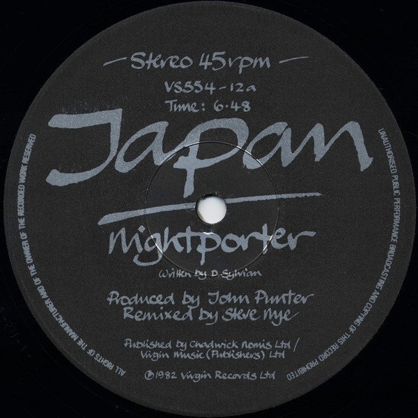 [Label - side A] — Stereo 45rpm — VS554 - 12a Time: 6·48 ℗ 1982 Virgin Records Ltd [Label - side B] — Stereo 45rpm — VS554 - 12b Time: 6·53 ℗ 1980 Virgin Records Ltd Taken from the album V2180 [m=74165] [Sleeve - spine] JAPAN — Nightporter — 12 Inch Single Virgin Records Ltd VS 554–12 [Sleeve - back] VS554–12 Nightporter ℗ 1982 Virgin Records Ltd Methods of Dance ℗ 1980 Virgin Records Ltd Virgin [logo] © 1982 Virgin Records Limited The stamped A in the runouts appears as the usual CBS Aston Clinton partially stamped symbol ⋀ or ∴ The runouts are etched (e.g. "VS - 554 - 12 - A1 ƱTOPIA"), except for the last two characters, which are usually a numeral and letter (e.g. "5A"), which are stamped. There are two other 12"s released in the UK using the same catalogue # VS554-12, but pressed/lacquer cut by different plants: * [url=http://www.discogs.com/release/5298349]pressed by EMI (Lacquer cut by Jack Adams) JA[/url] * [url=http://www.discogs.com/release/12784265]pressed by EMI (Lacquer cut by Tony Bridge) tone[/url]