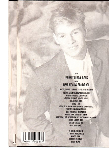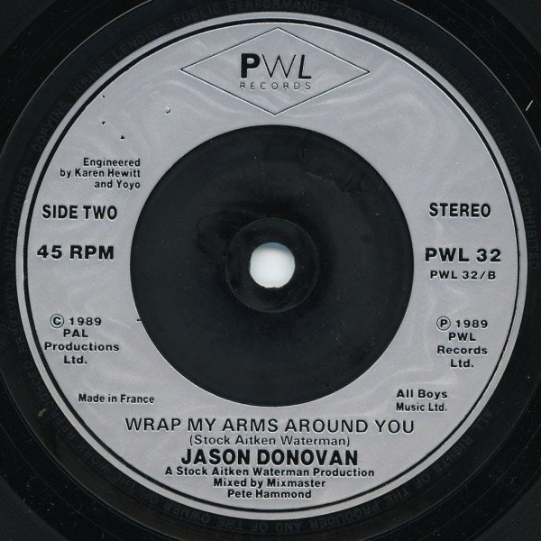 This release has: - silver injection moulded label - glossy thick cardboard sleeve - back opening measuring 87mm long and 5mm in its maximum depth on a left side, Other releases exist with different back opening [url=http://www.discogs.com/release/24451367](82mm long and 4 mm in its maximum depth)[/url] or with [url=http://www.discogs.com/release/6959466]paper label[/url]. See comparing pic#5: the sleeve of this release is the one at right. A Stock Aitken Waterman Production Recorded at PWL Studios 1 & 4, London Jason's vocals were recorded using the Calrec Soundfield Microphone ℗ 1989 PWL Records Ltd © 1989 PAL Productions Ltd [sleeve] Made in England [labels] Made in France