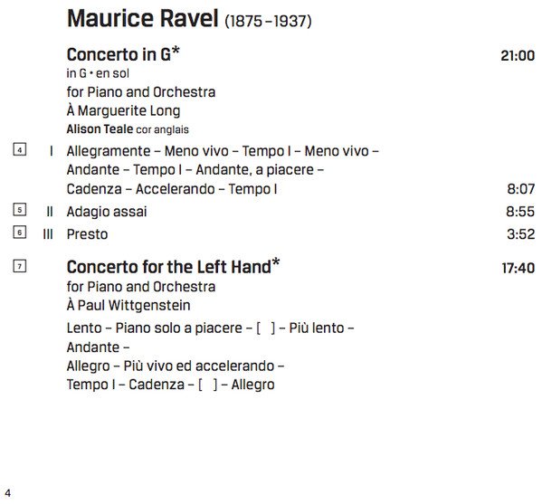 | 7 | Concerto For The Left Hand For Piano And Orchestra - À Paul Wittgenstein; Lento - Piano Solo A Piacere - [ ] - Più Lento - Andante - Allegro - Più Vivio Ed Accelerando - Tempo I - Cadenza - [ ] - Allegro | 17:40 |