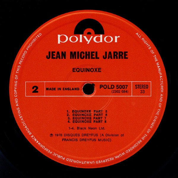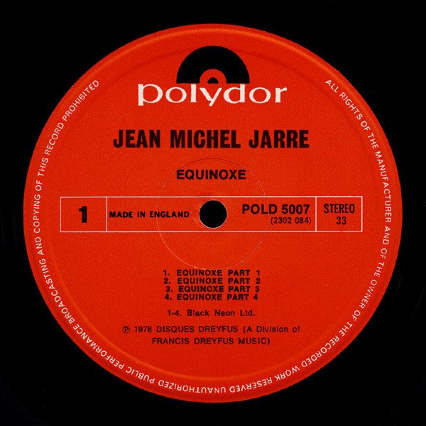 Original UK pressing with red vinyl labels and black and white close-up photo of Jean-Michel Jarre on the back of sleeve. Some copies come with a "Limited edition - special price" golden stamp on front sleeve. Other British releases with cat# 'POLD 5007': [This release]: red labels with 'Black Neon' text, design variant 1 [r=11314317]: red labels with 'Black Neon' text, design variant 2 [r=14092459]: red labels with 'Black Neon' text, design variant 3 [r=8987128]: red labels with 'Intersong Music' text [r=2511330]: red and blue labels Other British releases with cat# 'POLD 5007' included in the 2 LP Oxygene/Equinoxe releases: [r=319387]: red labels with 'Black Neon' text [r=5457482]: red labels with 'Intersong Music' text Polydor Deluxe Recorded at Jean-Michel Jarre private studio on MCI-Studio Equipment and mixed at Gang Studios - Paris from January to August 1978. Special thanks to Michel Geiss for his help and development of new instruments. All titles published by Francis Dreyfus Music. Disques Dreyfus A Division of Francis Dreyfus Music. Printed in England by Clout and Baker Ltd. Information on vinyl labels: 1-4. Black Neon Ltd. ℗ 1978 Disques Dreyfus (A Division of Francis Dreyfus Music) Made in England