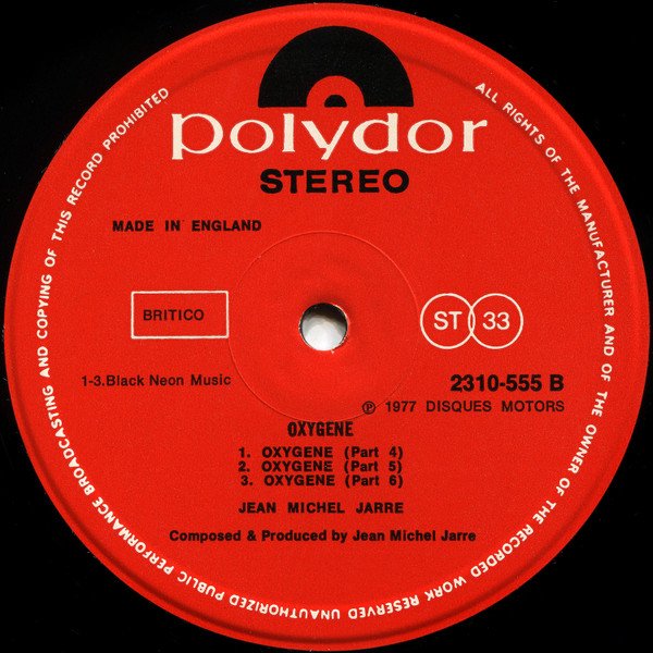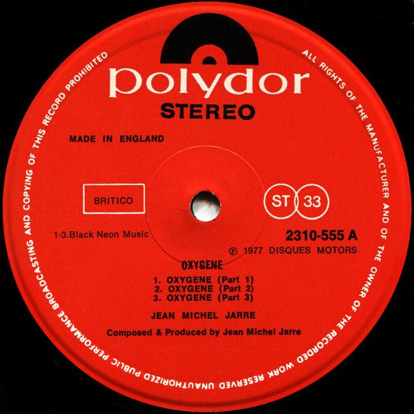 Other British releases with cat# '2310 555': [This release]: red labels with 'Britico' framed text, Phonodisc press [r=11943767]: red labels with 'Britico' framed text, PRS press [r=7391736]: red labels with 'Made in England' framed text [r=1756460]: red and blue labels Other British releases with cat# '2310 555' included in the 2 LP Oxygene/Equinoxe releases: [r=319387]: red labels with 'Britico' framed text [r=5457482]: red labels with 'Made in England' framed textAll titles published by Black Neon Music Limited.Manufactured and distributed in the U.K. by Polydor Records Ltd.Printed and made in England by James Upton Ltd.Recorded at Jean-Michel Jarre private studio and mixed at Gang Studio - Paris from August to November 1976.Cutting: Translab - Paris℗ 1977 © 1976 Disques MotorsThis version has a different lacquer cut company credit on the runouts from this other UK issue: [r=7391736]