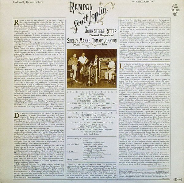 Title is "JEAN-PIERRE RAMPAL plays/spielt/joue SCOTT JOPLIN" on labels. Distribuee en France par CBS Disques Made in Holland B2 is spelled "The Chrysanthemum - An Afro-Intermezzo" on label Variant 2 stamped apart from ( A and B ) which are both etched.