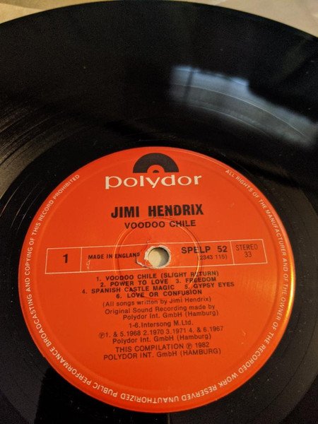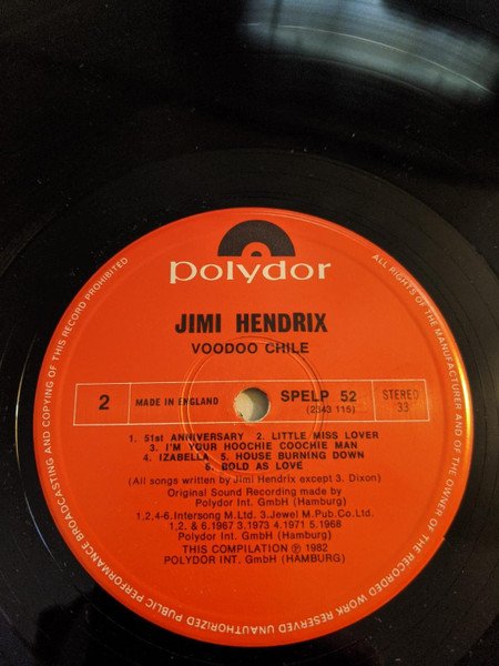 Polydor Mid-Price SPELP 52 This Compilation: Ⓟ1982 Polydor Int. GmbH. (Hamburg) Ⓒ1983 Polydor Ltd (UK) Made in England (cover) Compilation: From 'Electric Ladyland' (1968) - track A1, A5, B5 From 'Band of Gypsies' (1970) - track A2 From 'Cry of Love' (1971) - track A3 From 'Axis Bold As Love' (1967) - track A4, B2, B6 From 'Are You Experienced?' (1967) - track A6 From 'B' side (1967) - track B1 From 'Loose Ends' (1973) - track B3 From 'War Heroes' (1971) - track B4 Publishers: Track A1 to A6, B1, B2, B4 to B6: Intersong M. Ltd. Track B3: Jewel M. Pub. Co. Ltd.