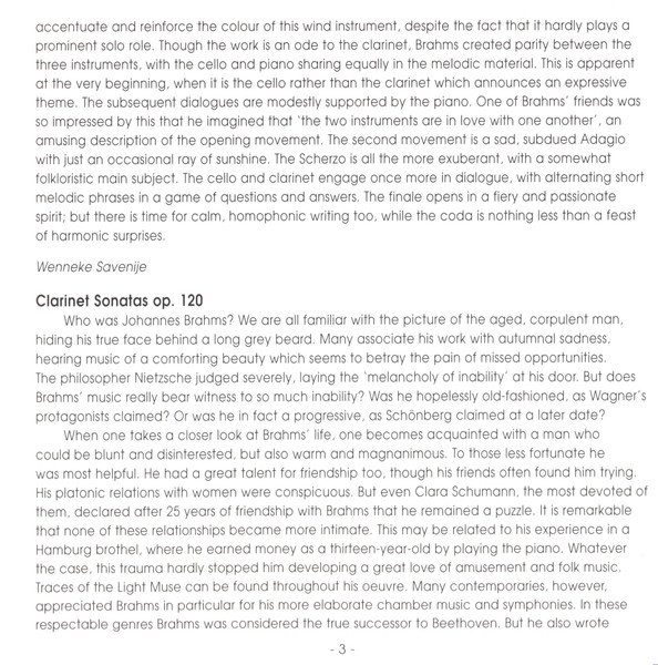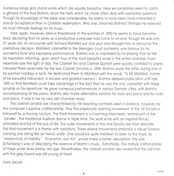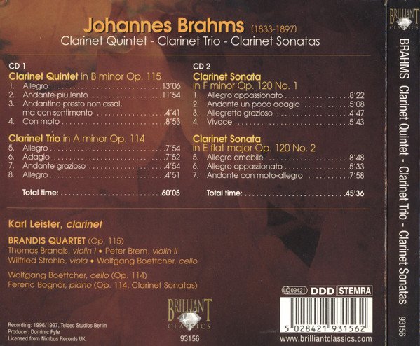 Recording: 1996/97, Teldec Studio, Berlin. Licensed from Nimbus Records, UK. Total time: 60'05 and 45'36 Packaging: six panel digipak. Second disc appeared separately as http://www.discogs.com/Johannes-Brahms-Clarinet-Sonatas/release/2533256
