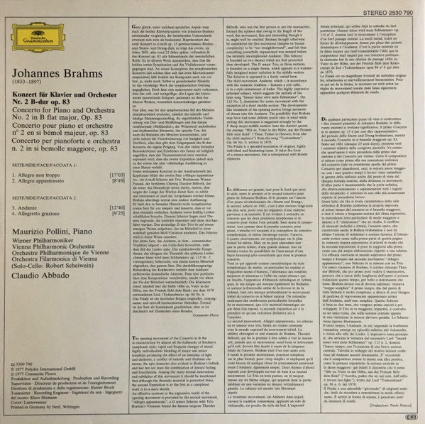 ——Sleeve info—— cassette 3300 790 ℗ 1977 Polydor International GmbH © 1977 Constantin Floros Printed in Germany by Neef, Wittingen —— liner notes in German, English and French, translated in Italian spine: Stereo Brahms: Klavierkonzert Nr. 2 · Maurizio Pollini · Wiener Philharmoniker · Claudio Abbado 2530 790 ——Centerlabels info—— Made in West Germany —— label design: straight borders; German copyright message in gold, at 12-1 o'clock "Alle Urheber"; no star on bottom