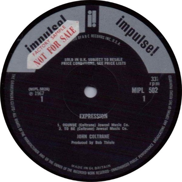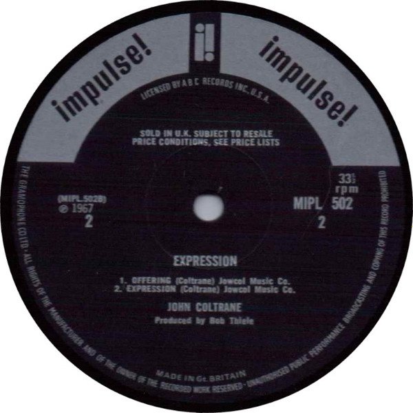 Recorded at Van Gelder Studio, Englewood Cliffs, New Jersey, February 15, 1967 (A2, B1), March 17, 1967 (A1, B2) according to the rear sleeve.Silver and black Impulse label. Comes in a flipback sleeve (non-gatefold).UK Stereo version (Impulse! SIPL 502) exists [url=http://www.discogs.com/John-Coltrane-Expression/release/2243094]here[/url].