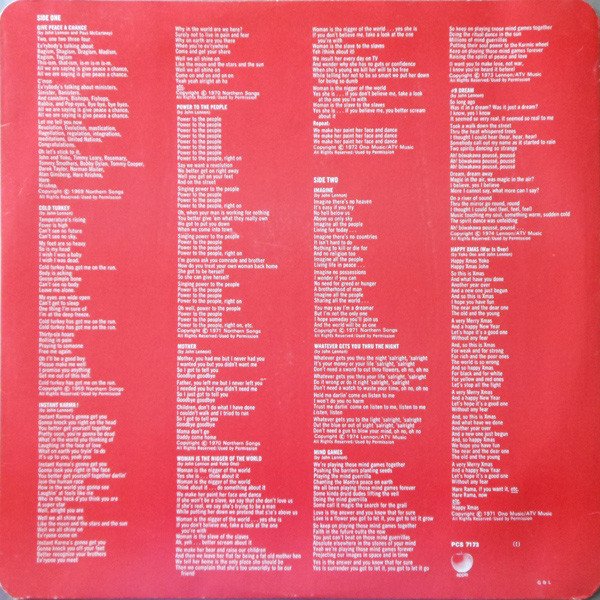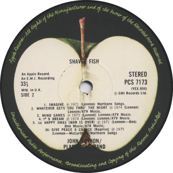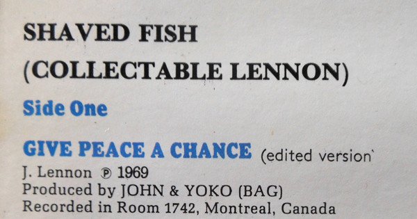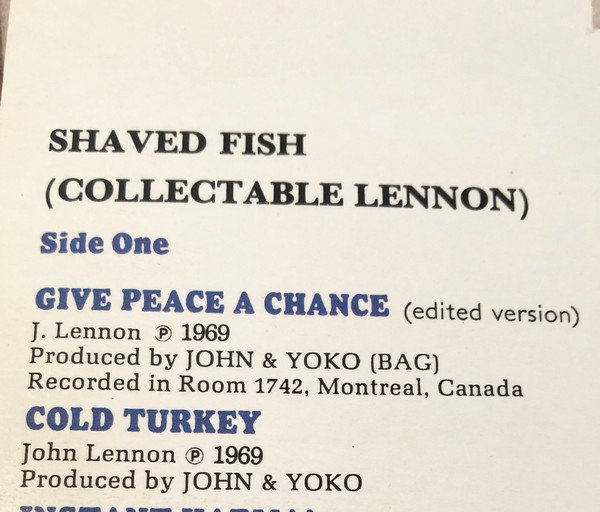This variation does not credit Paul McCartney for the song "Give Peace a Chance" on the back cover. The song is also listed as an edited version. (See picture details.)It also omits production credit to Phil Spector on Cold Turkey.The spine reads "John Lennon ● Shaved Fish" and on the back it is subtitled as "Collectable Lennon". Red/white inner sleeve with rounded corners, lyrics, and "G & L" printed at the bottom."A conspiracy of silence speaks louder than words" - Dr. Winston O'Boogie.Manufactured in U.K.
