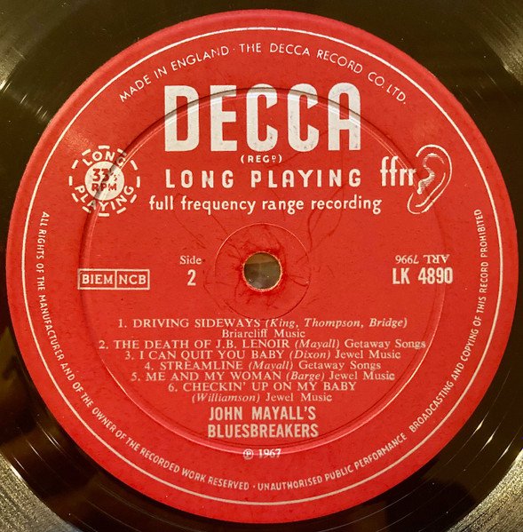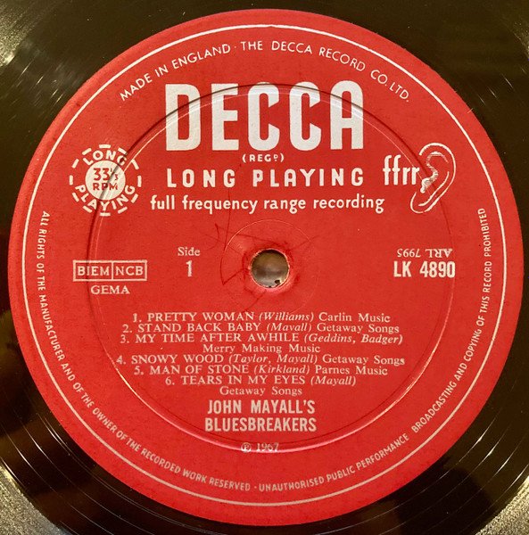 Front laminated sleeve with pinched spine endings. Recorded At Decca Studios, West Hampstead on 12th July 1967 A1 appears as "Oh, Pretty Woman" (Williams/Albert King) on cover, but as "Pretty Woman" (Williams) on label. A3 credits (Geddins/Buddy Guy) on cover, but (Geddins/Badger) on label. B1 credits (Freddy King) on cover, but (King, Thompson, Bridge) on label. B3 appears as "I Can't Quit You Baby" (Dixon/Otis Rush) on cover, but as "I Can Quit You Baby" (Dixon) on label. B5 credits (Barge/Little Joe Blue) on cover, but ((Barge) on label. B6 appears as "Checking On My Baby" on cover, but as "Checkin' Up On My Baby" on label. ℗ 1967 Publishing: • Carlin Music - A1. • Getaway Songs - A2, A4, A6, B2, B4. • Merry Making Music - A3. • Parnes Music - A5. • Briarcliff Music - B1. • Jewel Music - B3, B5, B6. Bottom line on rear cover reads: "Laminated with 'Clarifoil' made by British Celanese Limited" Runouts are stamped, except for the 'KT' etchings. Matrix# on labels appear upside down.