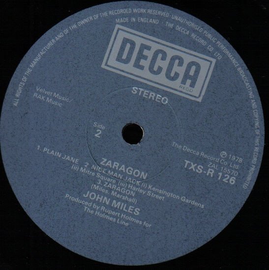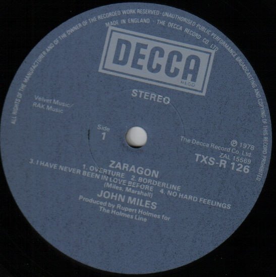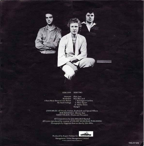 Issued with a printed lyric sheet. The almost identical version [r=12886127] has no MASTERDISK or RL etchings in the runouts. Runout details are machine stamped except hand etched '1-ARE', '2B-RE' and 'RL'. [Rear jacket:] Made in England ℗ 1978, The Decca Record Company Limited, London Sleeve printed in England by Robert Stace. [Insert:] All lyrics reproduced by courtesy of Velvet Music/RAK Publishing Photographs by Hipgnosis from an idea by John Miles Printed in England by Record Graphics Ltd. [White paper inner sleeve:] PATENT Nos. 1,125,555 1278 MADE IN GREAT BRITAIN [Labels:] Made in England · The Decca Record Co. Ltd. Velvet Music/RAK Music ℗ 1978 The Decca Record Co. Ltd.