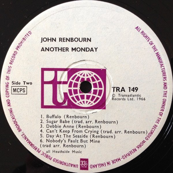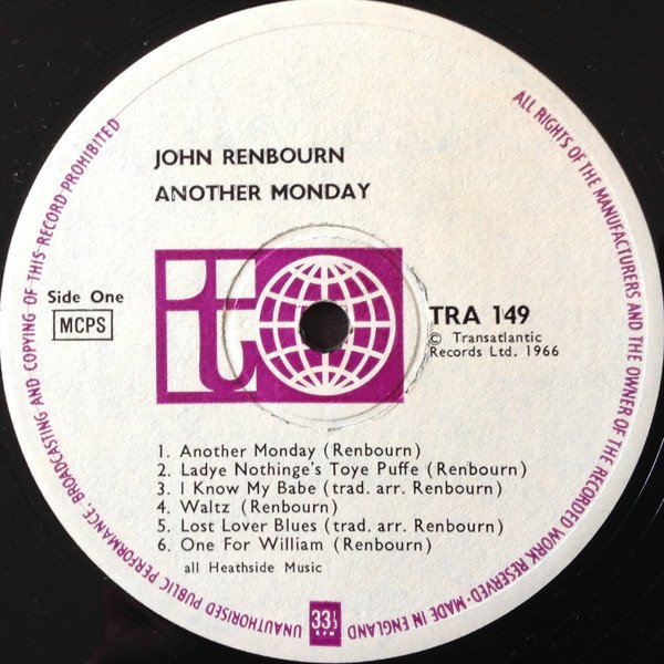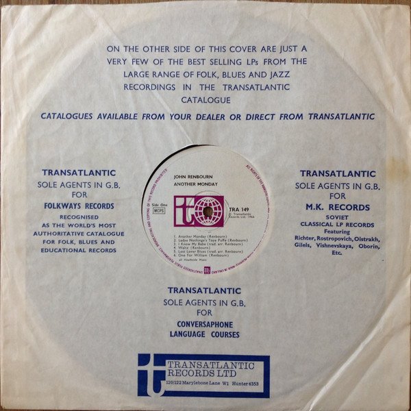 ⓒ Transatlantic Records Ltd. 1966 Recorded London 1966 Very similar to [url=https://www.discogs.com/release/1660955]this UK issue[/url], apart from the pressing ring and label layout variation. Also, this issue has no text on cover spine, where the other issue has "Another Monday TRA 149" printed on spine. Front laminated sleeve.