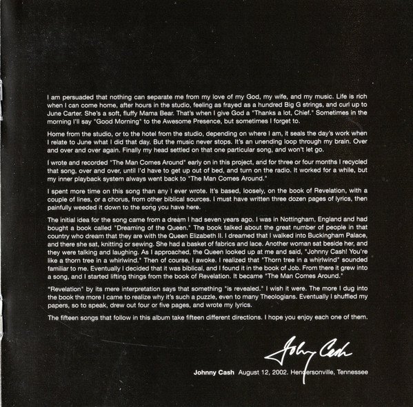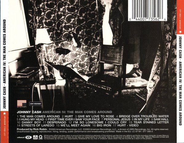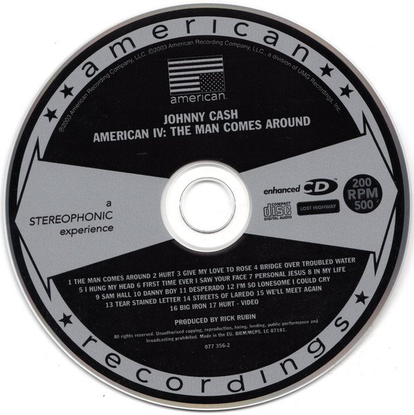 Special edition includes "Big Iron" and "Hurt" video. Issued with hype sticker stating "Brand New Studio Album Featuring Personal Jesus Plus The Acclaimed CD ROM Video Hurt 077 356-2" and 'Special Edition' sticker on the jewel case. Includes a 12 panel booklet of photographs, song and credits listing, and a typed commentary from Johnny Cash. Recorded at Cash Cabin Studio, Nashville, TN. Akademie Mathematique of Philosophical Sound Research, Los Angeles, CA. Mixed at Akademie Mathematique of Philosophical Sound Research, Los Angeles, CA. Mastered at Sony Mastering, New York, NY. Fiona Apple appears courtesy of Epic Records. Nick Cave appears courtesy of Anti Inc. Records. Don Henley appears courtesy of Warner Bros. Records. © 2002 American Recordings, LLC. ℗ 2003 American Recordings, LLC. © 2003 American Recordings, LLC., a division of UMG Recordings, Inc.