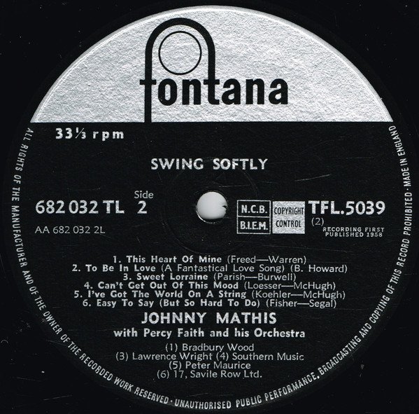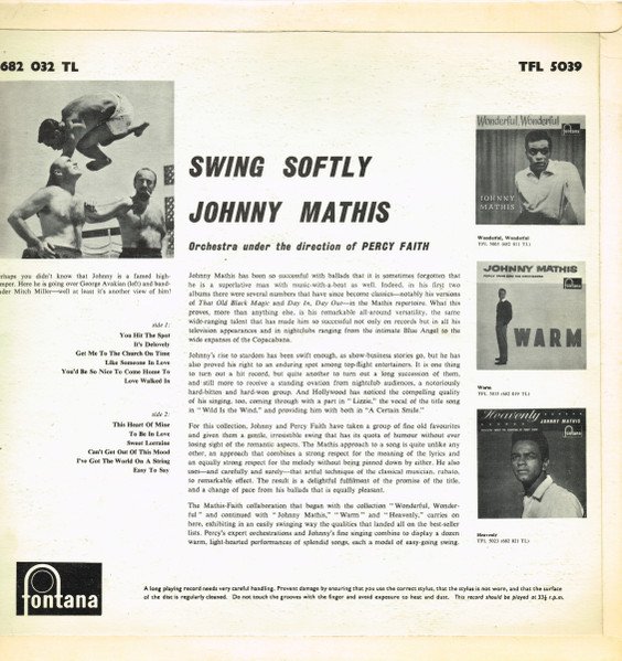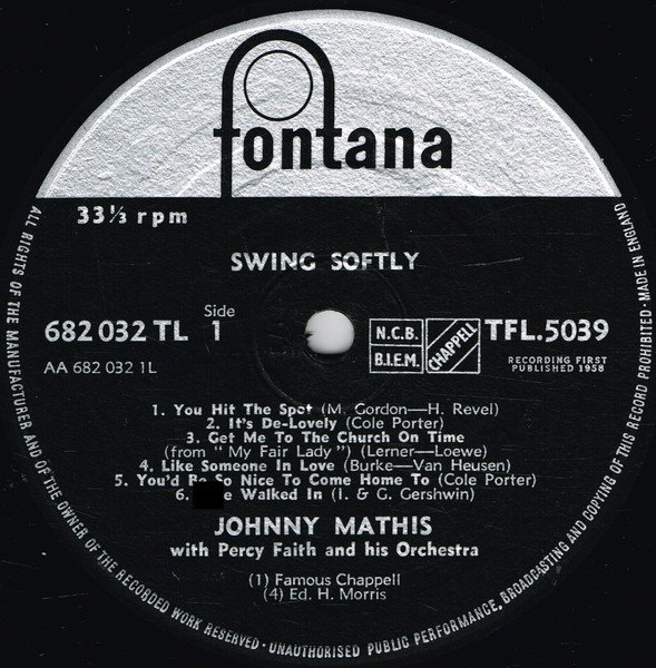 6th album by Johnny Mathis with orchestra under the direction of Percy Faith. First issue. Catalogue # is TFL 5039 on the rear cover and TFL.5039 on the labels.
