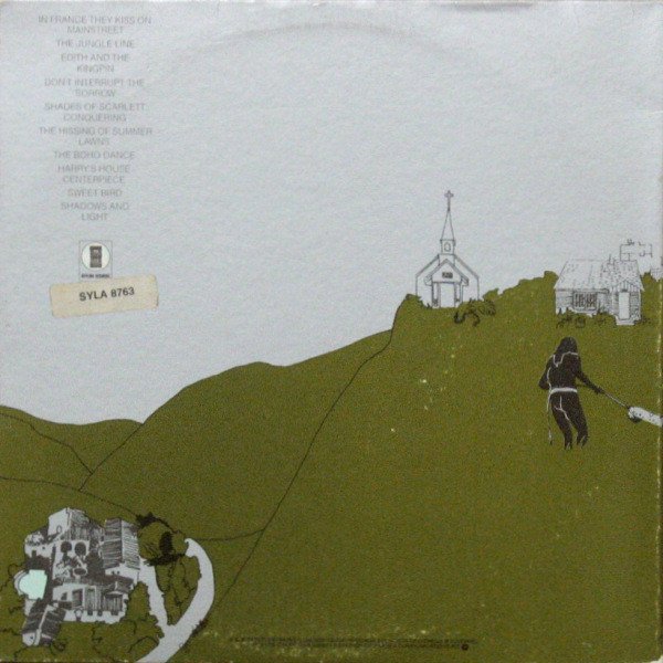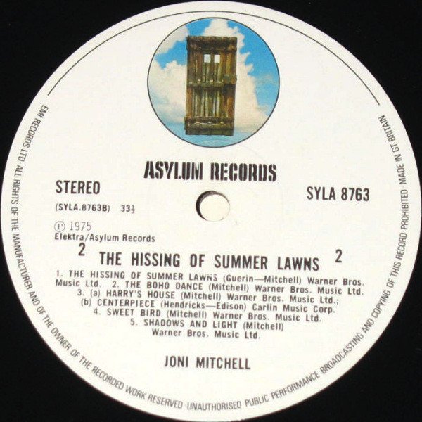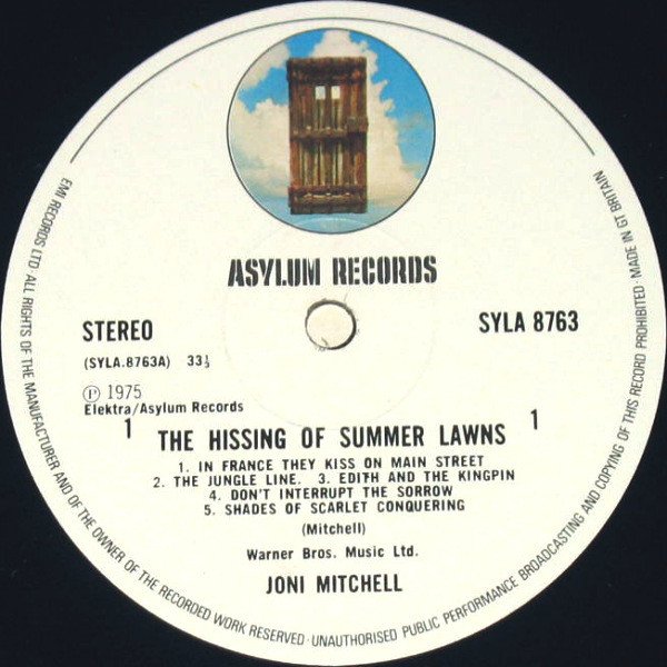 This very first UK issue comes in an embossed gatefold sleeve made in U.S.A. and a factory sticker with the UK catalogue number (SYLA 8763) on rear, placed over the printed US one (7E-1051), which is still visible on the spine. The record is the same as [r=517046], which was issued with an UK sleeve as soon as Garrod & Lofthouse provided them. Track A1 is spelled “In France They Kiss On Mainstreet” on rear sleeve, “In France They Kiss On Main Street” on the inside of the gatefold and on label. Track A5 is spelled “Shades Of Scarlett Conquering” both on rear and inside sleeve, “Shades Of Scarlet Conquering” on label. Track B3.b, Centrepiece, has incorrect writing credits of Johnny Mandel and Jon Hendricks on the the inner gatefold, however the label correctly credits Hendricks - Edison. [Sleeve] ℗ & © 1975 Elektra/Asylum/Nonesuch Records, 962 North La Cinega Boulevard, Los Angeles, California 90069 · A division of Warner Communications Inc. Ⓦ All songs © 1975 Crazy Crow Music BMI except “Centerpiece” published by Caphryl Music ASCAP ©1958 and "The Hissing Of Summer Lawns" published by Crazy Crow Music BMI and Mad Man's Drum Music ASCAP. [Labels] ℗ 1975 Elektra/Asylum Records Warner Bros, Music Ltd. “Centerpiece”: Carlin Music Corp. Runouts are stamped except for HTM etched.
