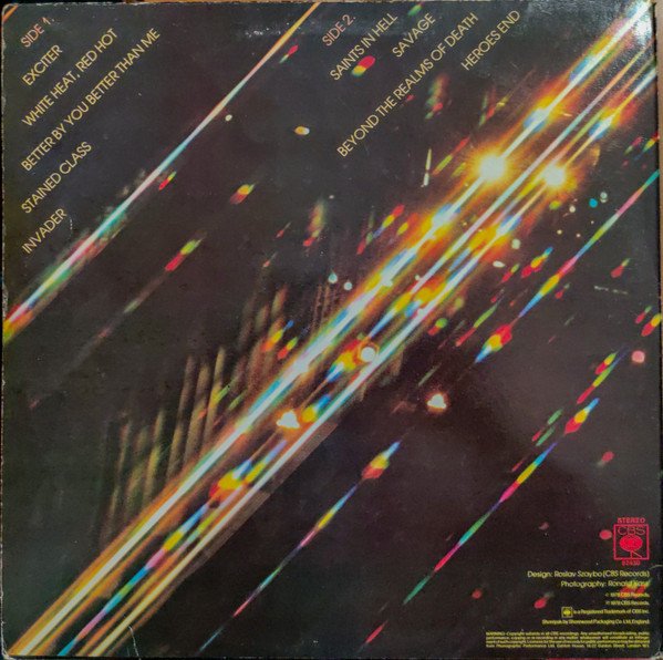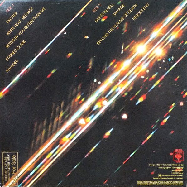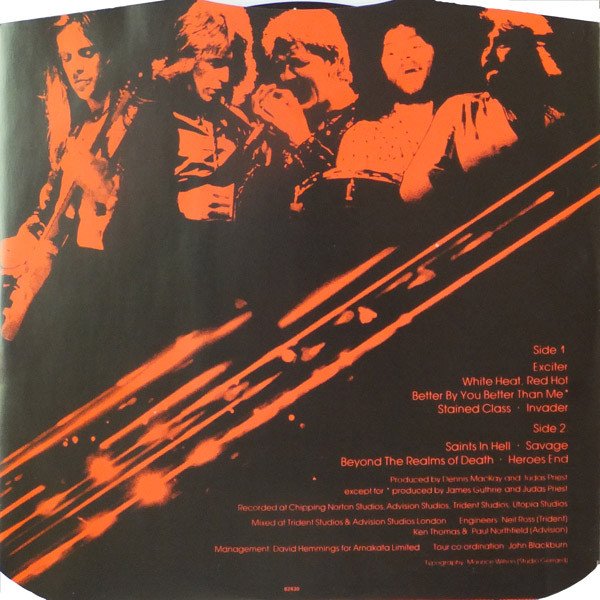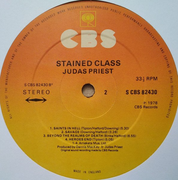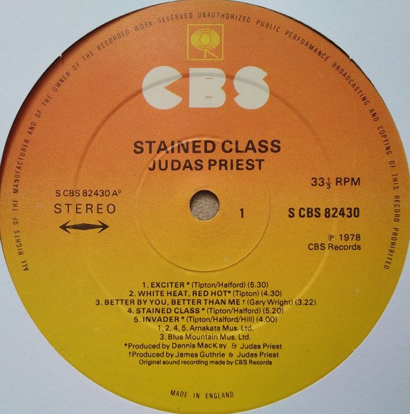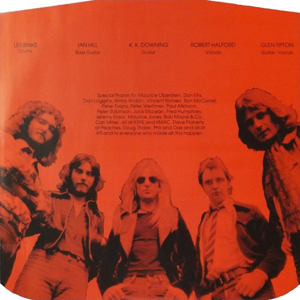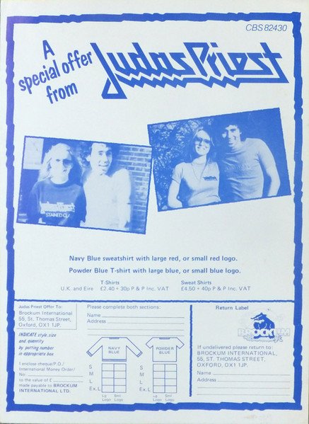 CBS 'Sunburst' labels. Gloss sleeve. Black/red printed inner sleeve with line-up, credits etc. This inner sleeve is of top opening card and has curved bottom corners, bevelled top corners plus a curved die cut thumb section. Some copies came with a good stamp identifying them as copies used for promotional purposes. Some copies came with an A5 order sheet for Judas Priest T-shirts by Brockum International, Oxford, bearing catalog number CBS 82430 as well. All selections published by Arnakata Music Ltd. except A3 published by Blue Mountain Music Ltd. © 1978 CBS Records ℗ 1978 CBS Records Made in England. Runouts are etched apart from stamped letters or numbers following [Lyre Symbol] or end of string.
