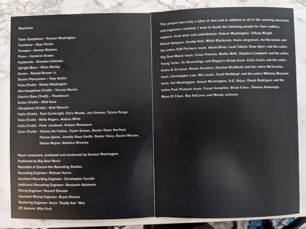 Standard card outer sleeve containing cover photo and reverse has cityscape photo with the EP title across the top. No barcode or other information on the back. Spine has artist name and EP title along with catalogue number. The record is standard black vinyl and comes in a basic black paper sleeve. This release also comes with a digital download code. Text on the barcode sticker on the reverse of the shrinkwrap: ℗ © 2017 Dom Chi No LLC. Under exclusive license to Young Turks Recordings Ltd. Text on the sticker on the front of the shrinkwrap: Kamasi Washington Harmony Of Difference Includes a booklet containing paintings and photographs from the project and release credits.