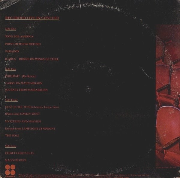 1st issued with NO UPC Barcode printed on back cover - Gatefold cover release. PZ2 35660 on jacket spine, 35660 on interior of jacket, both inner sleeves and all 4 vinyl labels. Note: Some covers are marked as "Promotional" with either a timing strip or gold stamp. This album has been recorded at various locations over the past three tours 1977-1978. Public Relations: [a2319125], 9454 Wilshire Blvd., Suite 309, Beverly Hills, CA 90212 Instrument companies: ARP, Kramer Guitars, Norlin, Paiste, Slingerland, Unicord. Special Thanks to the Following: Axis Studio & staff, V.S.I. Travel of London, International Business Management, Chuck Hurewitz, Marty Rothman, John Coray, [a436610], [a268927], Mike Leventon, [a346772], [a251644] for all his help. The cover photograph is a re-creation of the Norman Rockwell Saturday Evening Post cover illustration [April 6, 1946] "The Charwomen." © 1946 The Curtis Publishing Company. On August 14, 1978, while returning home from a Kansas concert, John Hoffert, a 14 year old from El Paso, Texas was involved in a car accident that cost him his sight. Being that Kansas was the last visual experience that John will ever have — we dedicate this album to him.