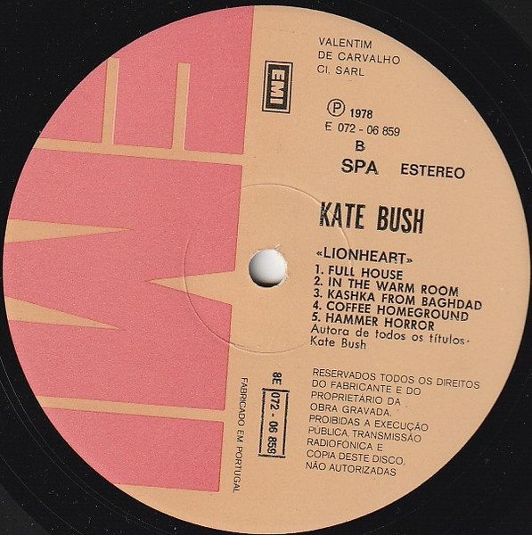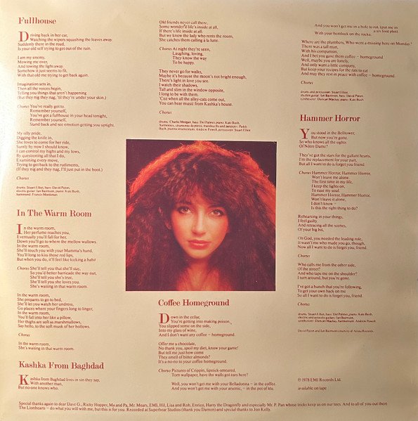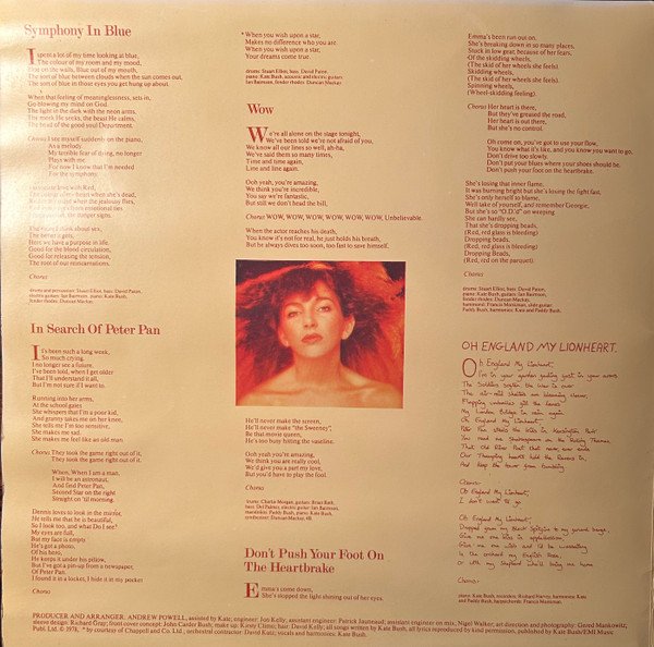 Recorded at Superbear Studios. All lyrics reproduced by kind permission, published by Kate Bush / EMI Music Publ. Ltd. (C) 1978. David Paton and Ian Bairnson courtesy of Arista Records. (P) 1978 EMI Records Ltd. Available on tape. Cat# 8E 072 06859 on the cover and spine Cat# E 072 - 06 859 on the labels Cat# 8E 072 06 859 on the labels Runout side A is stamped, except for the hand-etched "Blair", side B is etched with a pantograph Special thanks again to dear Dave G., Ricky Hopper, Ma and Pa, Mr. Mears, [l26126], Hil, Lisa and Rob, Erico, Harry the Dragonfly and especially Mr. P. Pan whose tricks keep us on our toes. And to all of you out there