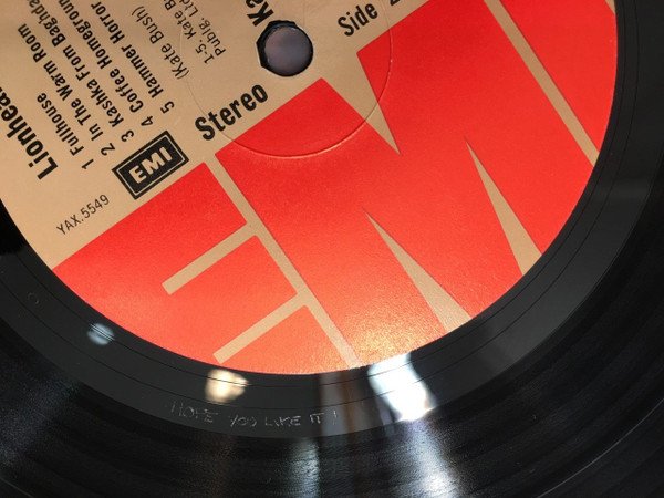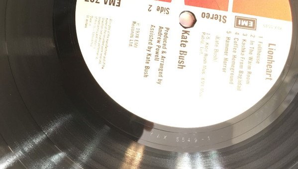 Track A2 incorporates the song "When You Wish Upon A Star" (From Walt Disney's "Pinocchio"), written by Leigh Harline and Ned Washington. "Kate Bush - Lionheart" text on front cover and rear cover are embossed. Gatefold sleeve with lyrics inside. Butter coloured inner bag with rounded corners, which has EMA 787(I) printed on top right of one side. 'HOPE YOU LIKE IT' etched in runouts, the rest stamped. Recorded at Superbear Studios. All lyrics reproduced by kind permission, published by Kate Bush / EMI Music Publ. Ltd. (C) 1978. David Paton and Ian Bairnson courtesy of Arista Records. (P) 1978 EMI Records Ltd. Available on tape. Made in Gt. Britain. Durations do not appear on this release. [r=10148817] is a later repress with different record labels [r=5536970] has "Made in Ireland" on the labels, otherwise identical