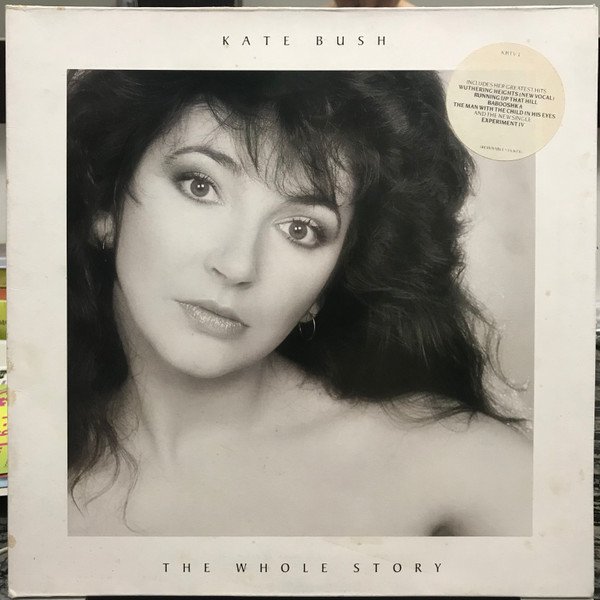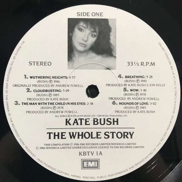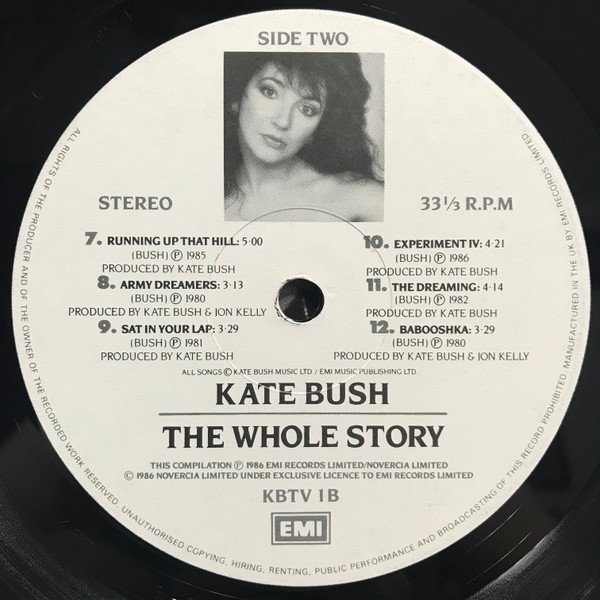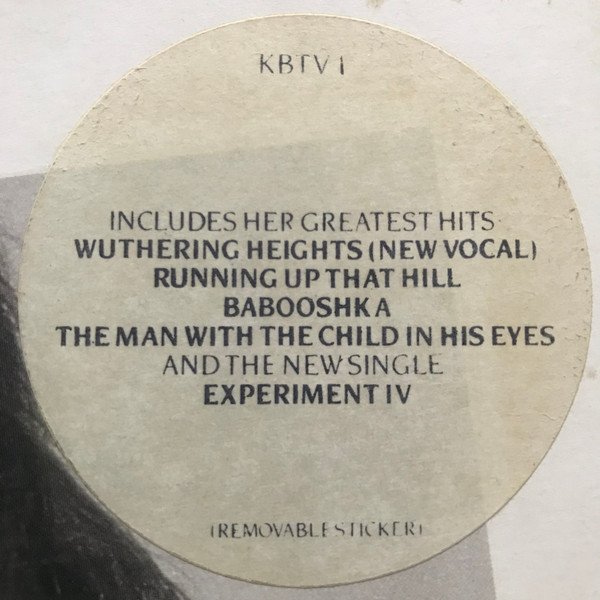 Tracks are numbered 1 to 12 throughout the release - with tracks on B-side numbered 7 to 12 (not 1 to 6 as on some other versions also with 'designed' labels). Gatefold sleeve has spot gloss varnish to colour images throughout. Black paper polylined inner. Matrices are stamped, except "TK" and "TOWNHOUSE" hand etched. "xx" appears sideways. [on sleeve front:] [some copies may come with a sticker:] "Includes her greatest hits: / Wuthering Heights (New Vocal) / Running Up That Hill / Babooshka / The Man With The Child In His Eyes / and the new single: / Experiment IV / (removable sticker)" [on sleeve rear:] [cassette logo]TC KBTV 1 [Cat# for cassette] CDP 7464142 [Cat# for CD] Also available on video This compilation ℗ 1986 EMI Records Limited/Novercia Limited © 1986 Novercia Limited under exclusive licence to EMI Records Limited [EMI logo] SP8611HP [inside gatefold:] Side One 1. Wuthering Heights ∙ originally released 4th November 1977; reached No. 1 2. Cloudbusting ∙ originally released 14th October 1985; reached No. 20 3. The Man With The Child In His Eyes ∙ originally released 28th May 1978; reached No. 6 4. Breathing ∙ originally released 14th April 1980; reached No. 16 5. Wow ∙ originally released 5th March 1979; reached No. 14 6. Hounds Of Love ∙ originally released 24th February 1985; reached No. 18 Side Two 1. Running Up That Hill ∙ originally released 5th August 1985; reached No. 3 2. Army Dreamers ∙ originally released 22nd September 1980; reached No. 16 3. Sat In Your Lap ∙ originally released 30th June 1981; reached No. 11 4. Experiment IV ∙ originally released 27th October 1986; still in charts on release of album 5. The Dreaming ∙ originally released 26th July 1982; reached No. 48 6. Babooshka ∙ originally released 23rd June 1980; reached No. 5 The Albums 1. The Kick Inside ∙ originally released 17th February 1978; reached No. 3 2. Lionheart ∙ originally released 13th November 1978; reached No. 6 3. Never For Ever ∙ originally released 7th September 1980; reached No. 1 4. The Dreaming ∙ originally released 14th February 1982; reached No. 3 5. Hounds Of Love ∙ originally released 16th September 1985; reached No. 1 Kate Bush: Live On Stage E∙P ∙ originally released 3rd September 1979; reached No. 10 The Single File ∙ originally released 1st December 1983 Also available, The Videos:- The Single File ∙ Kate: Live At Hammersmith Odeon and The Hair Of The Hound E∙P All songs © Kate Bush Music Ltd./EMI Publishing Ltd. This compilation ℗ 1986. Original sound recordings made by Novercia Ltd. Under exclusive licence to EMI Ltd. Tracks A4, B2 and B6 ℗ 1980 Original sound recordings made by EMI Records Limited. Tracks A3 and A5 ℗ 1978 Original sound recordings made by EMI Records Limited. Tracks A2, A6 and B1 ℗ 1985 Original sound recordings made by Novercia Limited under exclusive license to EMI Records Limited. Track B3 ℗ 1981 Original sound recordings made by Novercia Limited under exclusive license to EMI Records Limited. Track B5 ℗ 1982 Original sound recordings made by Novercia Limited under exclusive licence to EMI Records Limited. Tracks A1 and B4 ℗ 1986 Original sound recordings made by Novercia Limited under exclusive licence to EMI Records Limited. This compilation ℗ 1986 EMI Records Limited/Novercia Limited. © 1986 Novercia Limited: Under exclusive licence to EMI Records Limited. [on labels:] This compilation ℗ 1986 EMI Records Limited/Novercia Limited © 1986 Novercia Limited under exclusive licence to EMI Records Limited [on label rims:] Manufactured in the UK by EMI Records Ltd.