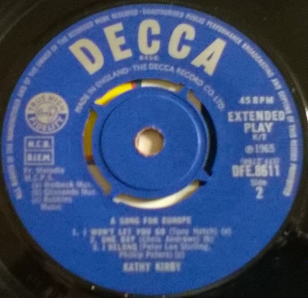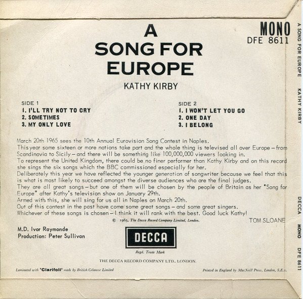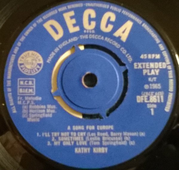 This EP comprised the six potential choices for the UK Eurovision Entry 1965. In the end, B3 (I Belong) was picked. 'I Belong' and 'I'll Try Not To Cry' are different versions than those issued on the 2 track Decca single, F.12087 Alternative picture sleeve with 'BBC-TV's Song For Europe 1965' title on the front sleeve and 'A Song For Europe' title on the back sleeve. Disc title is 'A Song For Europe'.