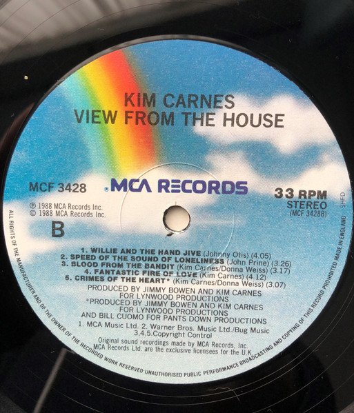 Produced for Lynwood Productions. "Crimes Of The Heart" produced for Lynwood Productions and for Pants Down Productions. Digitally recorded at Soundstage Studios using the Mitsubishi X-850 32 track system. "Crimes Of The Heart" recorded at Manzanita Recording Studio. Overdubs recorded at Soundstage Studio and Emerald Studio. Additional overdubs at Galaxy Sound Studio. Mixed at A&M Studios; at Soundstage; at Masterfonics. Mastered at Sterling Sound. [sleeve] © 1988 MCA Records, Inc. ℗ 1988 MCA Records, Inc. [labels] © 1988 MCA Records, Inc. ℗ 1988 MCA Records, Inc. Publishing Details:- A1, A2, B3, B4, B5 - Copyright Control A3 - Warner Bros.Music Ltd. / Chrysalis Music Ltd. / Copyright Control. A4, B1 - MCA Music Ltd. A5 - Warner Bros.Music Ltd. / Bug Music / Carlin Music Corp. B2 - Warner Bros.Music Ltd. / Bug Music. Bruce Hornsby appears courtesy of RCA Records Vince Gill appears courtesy of RCA Records Mark O'Connor appears courtesy of Warner Bros. Records Inc. Also available on Cassette and Compact Digital Disc All matrix runouts are stamped except DB.TAPEone which is etched.