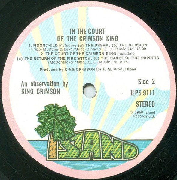 ℗ 1969 Island Records Ltd. Originally released October 10th 1969. This version has centre labels with a 'pink rim/palm tree' design that indicate the release date is likely to be no earlier than 1970. Gatefold sleeve - Printed in England by Robor Limited. A similar [url=http://www.discogs.com/release/370515]version[/url] is printed by E. J. Day Group. Catalog numbers: - ILPS 9111 on center labels, sleeve and spine - ILPS-9111 inside gatefold Titles on sleeve: A3: Epitaph including March For No Reason and Tomorrow And Tomorrow B1: Moonchild including The Dream And The Illusion B2: The Court Of The Crimson King including The Return Of The Fire Witch and The Dance Of The Puppets Produced for E.G. Productions, 'David & John'. Recorded at Wessex Sound Studios, London. All songs published by E.G. Music Ltd.