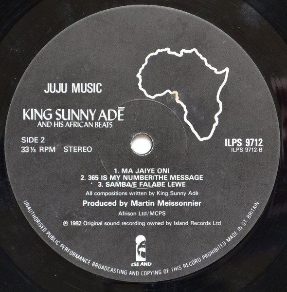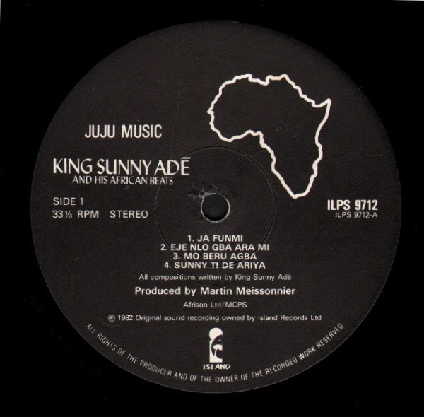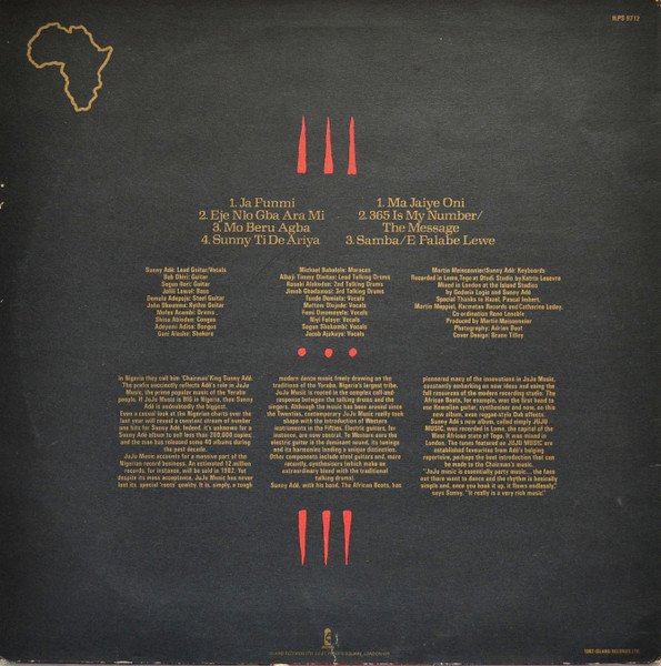 "JuJu Music is essentially party music.. the fans out there want to dance and the rhythm is basically simple and, once you hook it up, it flows endlessly, says Sunny." Runouts stamped except GRAEME - SOUND CLINIC etched. Black polylined innersleeve.