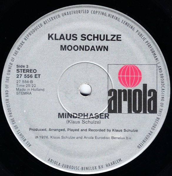 Rec January 1976 at Studio Panne-Paulsen, Frankfurt. Special thanks to Crumar (Italy and Dortmund) and to Farfisa (Bensberg). This version denotes [l=Ariola Eurodisc Benelux B.V.] at the bottom of the labels, otherwise similar to [url=https://www.discogs.com/release/12200590]the successor with the Ariola Benelux B.V. instead.[/url]