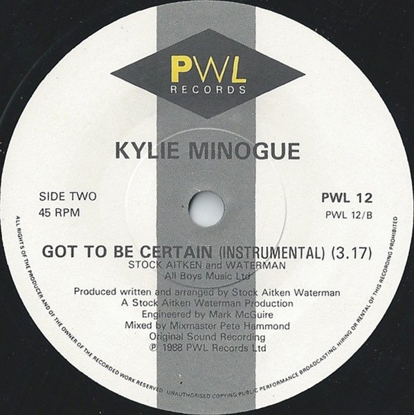 ℗ 1988 PWL Records Ltd © 1988 Mushroom Records Pty Ltd Aust. Marketed by PWL. 4/7 The Vineyard, London Se1 1QL Distributed by Pinnacle Made in EnglandKaren Hewitt's engineering credit ony appears on the sleeve. Kylie's vocals were recorded using the Calrec Soundfield Microphone.