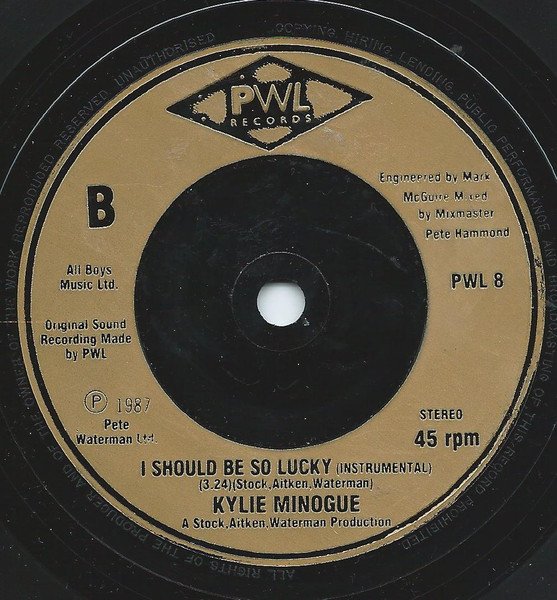 This release features the original 7" mix. This original 7" mix features Kylie singing a 'full chorus' after the middle 8, then an 'ad-lib only chorus', then a final 'full chorus' until the song fades out. Later pressing of I Should Be So Lucky and all further releases where the song appears (album, greatest hits and compilations) all feature the other mix of the song. This 'later' mix has a different structure after the middle 8. Kylie sings a 'half/ad lib only chorus' after the middle 8, then an 'ad-lib only chorus', then a final 'full chorus' until the song fades out. In glossy card sleeve. Sleeve: Kylies vocals were recorded using the Calrec Sound Field Microphone. Recorded and mixed at PWL - Today's Sound Tomorrow's Technology - Studios 1 and 2. © 1987 Mushroom Records Pty. Ltd. Aust. Sleeve & center labels: Original sound recording made by PWL ℗ 1987 Pete Waterman Ltd.