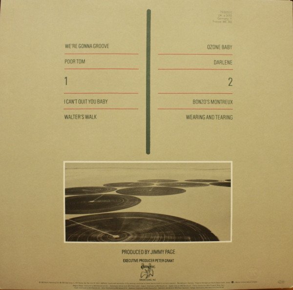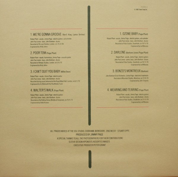 Released in a gatefold sleeve, embossed CODA lettering, comes with printed inner sleeve ℗ 1982 Atlantic Recording Corp. © 1982 Swan Song Inc. Track A1: Recorded at Morgan Studios, on 25/6/69. Track A2: Recorded at Olympic Studios, on 5/6/70. Track A3: Recorded at The Royal Albert Hall, on 9/1/70. Track A4: Recorded at Stargroves, on 15/5/72. Track B1: Recorded at Polar Studios, Stockholm, on 14/11/78. Track B2: Recorded at Polar Studios, Stockholm, on 16/11/78. Track B3: Recorded at Mountain Studios, Montreux, on 12/9/76. Track B4: Recorded at Polar Studios, Stockholm, on 21/11/78. Made by WEA Musik GmbH. A Warner Communications Company Runouts are stamped, with exception of „RAYS“, which is etched. Embossed „w“ on rear side of the sleeve.