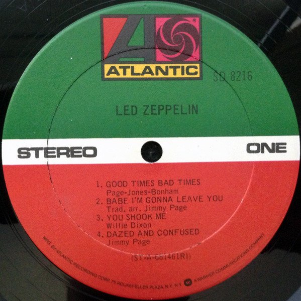© 1969 Atlantic Recording Corporation [l408779] - Denoted by "PRC" etched in runouts. Matrix label variant pressing @ RI = PRC Recording Company, Richmond, IN (based on company specific matrix numbers in the matrix/runout area). Although B5 is listed with a shorter duration, it actually plays for about 8:28. Rim Text has the "WB logo" - "Mfg By Atlantic Recording Corp 75 Rockefeller Plaza NY, NY "WB logo" A Warner Communications Company".