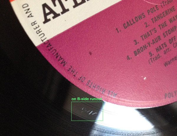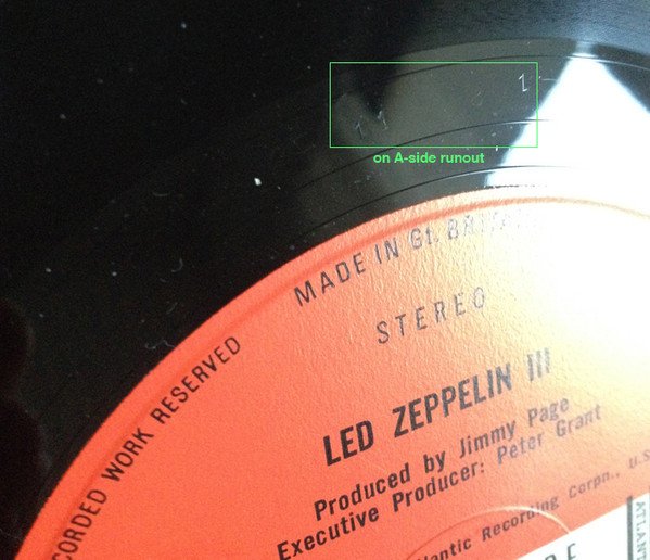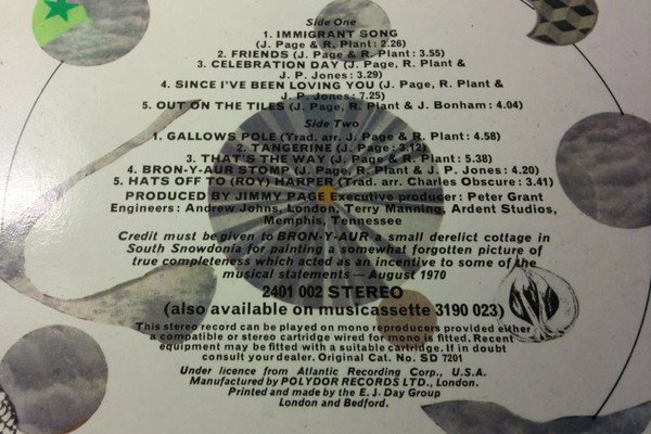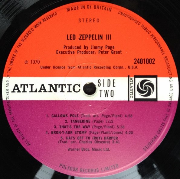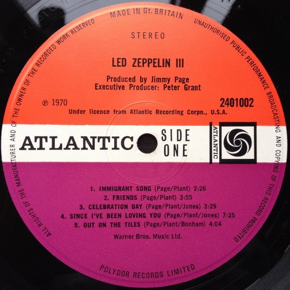 Released on the Atlantic "red/plum" label in fully laminated gatefold sleeve with working wheel. 1st cat# on labels, 2nd cat# on sleeve Specific to the first pressing; (1) 2401002 (on labels) (2) Produced by Jimmy Page, Executive Producer: Peter Grant (credited on top half of labels) (3) Warner Bros. Music Ltd. (4) Matrix numbers end with A5 and B5. Various matrix number combinations from A6/A7 to B5/B6/B7 may exist with the above described first generation of label. They are transitional copies from the first pressing to the second pressing (the ones without Peter Grant credits), and they are later copies. Under License from Atlantic Recording Corp., U.S.A. Manufactured for Polydor Records Ltd., London Printed and made by the E. J. Day Group London and Bedford. Directly after the Peter Grant credit was removed another label was released with a track error. The track 'Celebration Day' was incorrectly typed 'Celebration' and was immediately changed to the latter label variation. ℗ 1970 Subsequent pressings released on the red/plum labels do not have the Executive Producer Peter Grant credits on the label, the label cat# appears as 2401-002 and the publisher credits appear only as Warner Bros. Music. Runouts are etched, except for Phonodisc's father-, mother- and stamper-numbers, which are stamped.