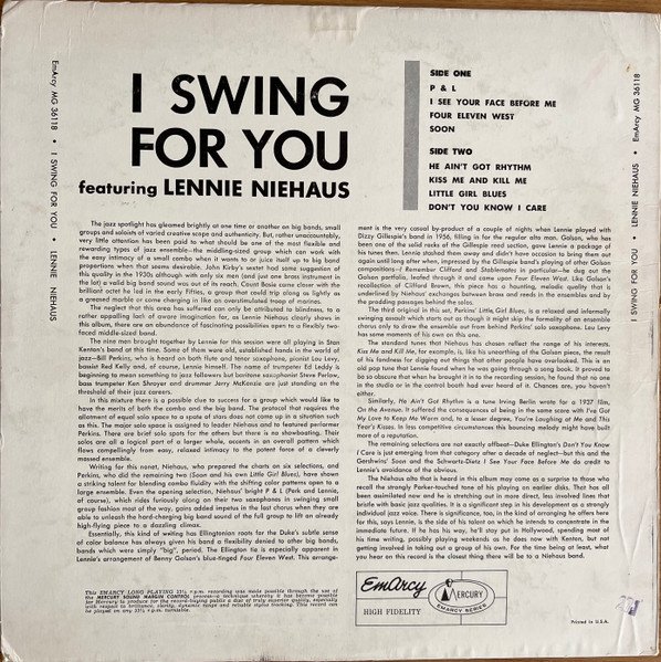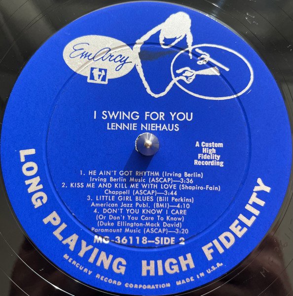 Blue label with silver print. Drummer logo. Artist is named "Lenny" Niehaus on front cover. "Lennie" Niehaus (his usual spelling) is used on back cover, spine, label and in the liner notes, including where the musicians are described.