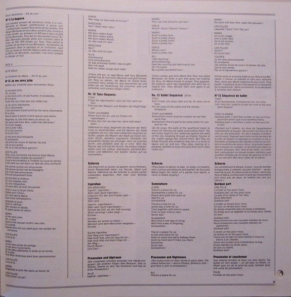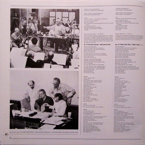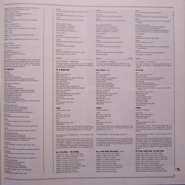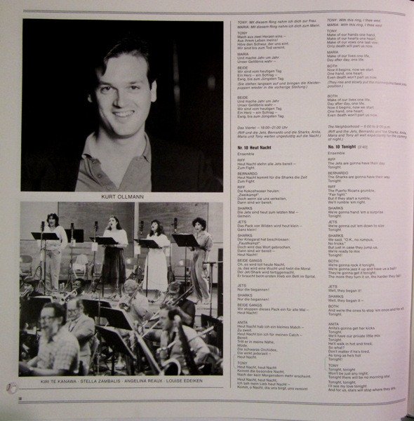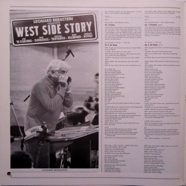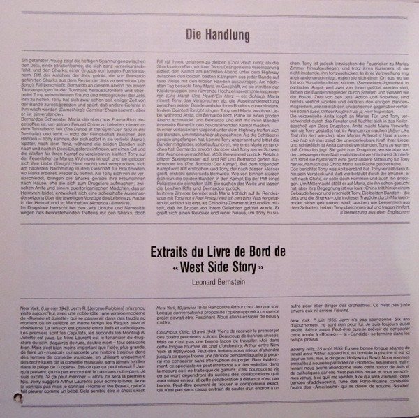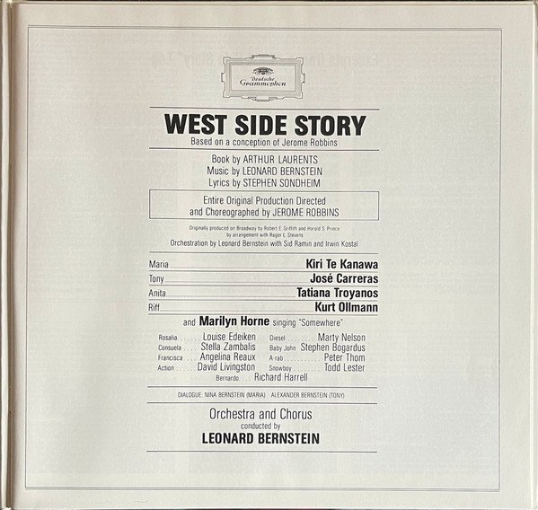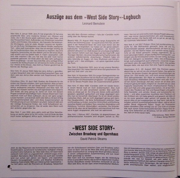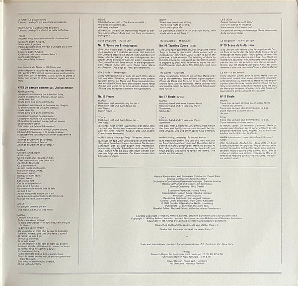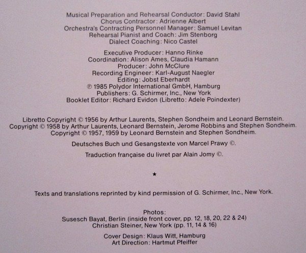 Gatefold sleeve & booklet assembled by 'PRS Hannover'. Gatefold inner image has colors (instead of B&W) and gatefold cover with 24 page booklet containing liner notes in English, German, French and Italian, and lyrics in German, English and French. PRS Hannover embosser on back cover, lower left part (8,7cm from left side) Cover info: Digital Recording Originally produced on Broadway by Robert E. Griffith and Harold S. Prince by arrangement with Roger L. Stevens ℗ 1985 Polydor International GmbH, Hamburg Cassette catalog# 415 253-4 GH2 CD catalog# 415 253-2 GH2 Made in West Germany Printed in West Germany by Münstermann-Druck KG, Hannover NB. Also versions printed by J. Alt GmbH, Niederdorfelden Booklet info: Reprinted from the notes to the Original Broadway Cast recording by courtesy of CBS Masterworks. © 1957 CBS Inc. German translation of Leonard Bernstein notes: © Knaus Verlag München Publishers: G. Schirmer, Inc., New York Libretto Copyright © 1956 by Arthur Laurents, Stephen Sondheim and Leonard Bernstein. Copyright © 1958 by Arthur Laurents, Leonard Bernstein, Jerome Robbins and Stephen Sondheim. Copyright © 1957, 1959 by Leonard Bernstein and Stephen Sondheim. Texts and translations reprinted by kind permission of G. Schirmer, Inc., New York Cover Design: Klaus Witt, Hamburg Runouts are stamped