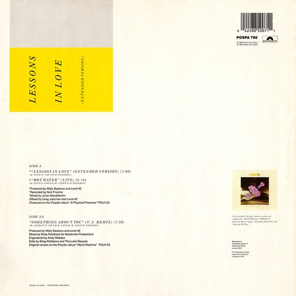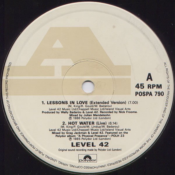 Track A2 featured on the Polydor album [url=http://www.discogs.com/Level-42-A-Physical-Presence/master/65431]"A Physical Presence"[/url] POLH 23 Track AA original version on the Polydor album [url=http://www.discogs.com/Level-42-World-Machine/master/85300]"World Machine"[/url] POLH 25 Track AA mixed for Mastermix Productions. Level 42 Music Ltd/Chappell Music Ltd/Island Visual Arts. Track A1 ℗ 1986 Polydor Ltd (London) Tracks A2 & AA ℗ 1985 Polydor Ltd (London) © 1986 Polydor Ltd (London) Original sound recording made by Polydor Ltd (London)