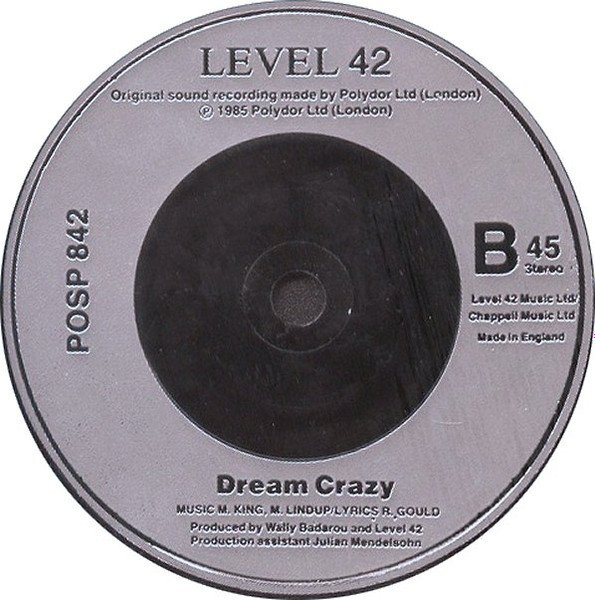 Silver, injection label; though some were released with a [url=http://www.discogs.com/release/2651716]blue, on white paper label[/url].Label Notes: Made In England Original sound recording made by Polydor Ltd. (London) [A-Side] Level 42 Music Ltd. / Chappell Music Ltd. / Island Visual Arts ℗ 1987 Polydor Ltd. (London) [B-Side] Level 42 Music Ltd. / Chappell Music Ltd. ℗ 1985 Polydor Ltd. (London)Sleeve Notes: Paul Crockford and Paul King for Outlaw Management Ltd 36-38 West Street London WC2H 9NA Fan Club Information: Level 42 Fan Club P.O. Box 507 London N1 4TD ℗ 1987 Polydor Ltd. (London) © 1987 Polydor Ltd. (London) [A-Side] Featured on the forthcoming album ' [url=http://www.discogs.com/release/310232]Running in the family[/url] ' [Pertaining to Julian Mendelsohn] with thanks to Spike Drake [B-Side] Featured on the cassette and compact disc ' [url=http://www.discogs.com/release/499095]World Machine[/url] 'Release Notes: Mastered using digital mix facility.
