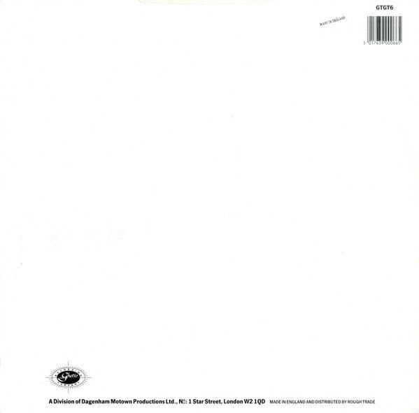 Made in England and distributed by Rough Trade. The first catalog number, GTGT6, appears on the sleeve; the second catalog number, GTGT 6, appears on the center labels.