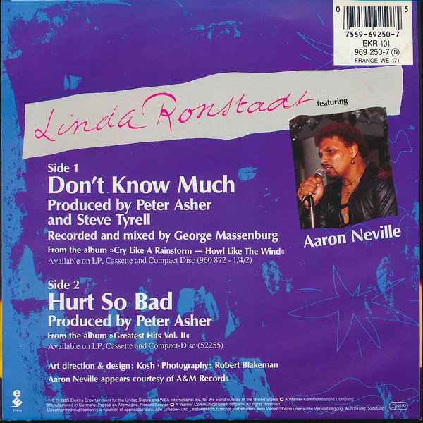 [Back cover] Aaron Neville appears courtesy of A&M Records Track A: From the album »Cry Like A Rainstorm - Howl Like The Wind« Available on LP, Cassette and Compact Disc [url=http://www.discogs.com/Linda-Ronstadt-Featuring-Aaron-Neville-Cry-Like-A-Rainstorm-Howl-Like-The-Wind/release/1658155](960872-1)[/url]/[url=http://www.discogs.com/Linda-Ronstadt-Featuring-Aaron-Neville-Cry-Like-A-Rainstorm-Howl-Like-The-Wind/release/3633931](960872-4)[/url]/[url=http://www.discogs.com/Linda-Ronstadt-Featuring-Aaron-Neville-Cry-Like-A-Rainstorm-Howl-Like-The-Wind/release/1551250](960872-2)[/url] Track B: From the album »Greatest Hits Vol. II« Available on LP, Cassette and Compact Disc [url=http://www.discogs.com/Linda-Ronstadt-Greatest-Hits-Volume-Two/master/14677](52255)[/url] ℗ & © 1989 Elektra Entertainment for the United States and WEA International Inc. for the world outside the United States. [Warner logo] A Warner Communications Company. Manufactured in Germany. Pressé en Allemagne. Record Service [Warner logo] A Warner Communications Company. [Labels] Made in Germany by WEA Musik GmbH [Warner logo] A Warner Communications Company Side A: ℗ 1989 Elektra Entertainment for the US & WEA International Inc for the world outside U.S. EMI Blackwood Music Inc. on behalf of ATV Music Corp. and Mann and Weil Songs/Snow Music/Brain Tree Music, BMI Side B: ℗ 1980 Elektra/Asylum Records for the U.S. & WEA International Inc. for the world outside U.S. Vogue Music, BMI [Additional info] This is the small centre hole version. Also issued with a [url=https://www.discogs.com/release/15415090]large centre hole[/url].