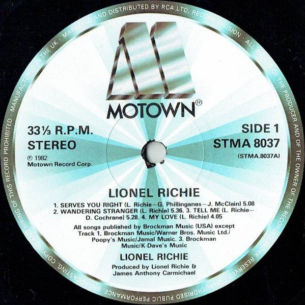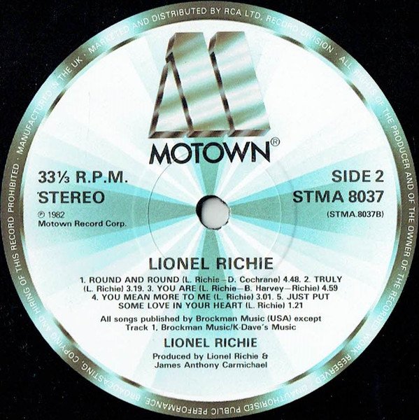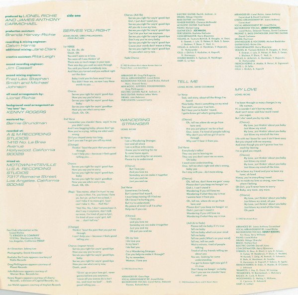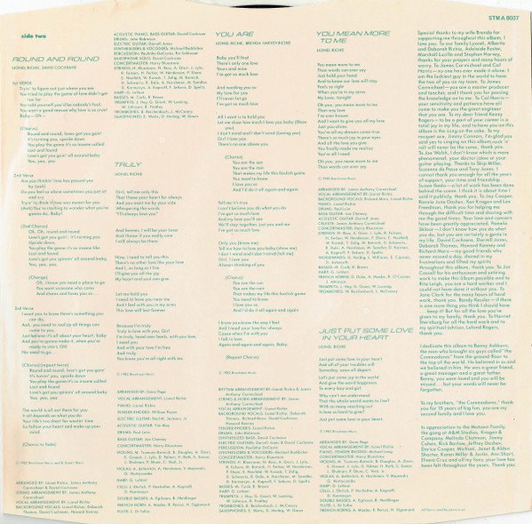 Gatefold cover, with a printed inner sleeve. On back cover: Cassette: CSTMA 8037 ℗ 1982 Motown Record Corporation Made from masters of Motown Record Corporation. Marketed and distributed by RCA Ltd. On inner sleeve: Recorded at: A & M Recording Studios 1416 No. La Brea Avenue Hollywood, California 90028 Mixed at: Motown/Hitsville U.S.A. Recording Studios 7317 Romaine Street Los Angeles, California 90046 Paulinho Da Costa appears courtesy of Pablo Records Greg Phillinganes appears courtesy of Planet Records John Robinson appears courtesy of Warner Bros. Records Inc. Kenny Rogers appears courtesy of Liberty Records, a division of Capitol Records, Inc. Joe Walsh appears courtesy of Asylum Records A1 © 1982 Brockman Music Warner Brothers Music Ltd Poopy's Music and Jamal Music A2, A4, B2, B3, B4 and B5 © 1982 Brockman Music A3 and B1 © 1982 Brockman Music and K-Dave's Music On labels: Manufactured in the UK Marketed and distributed by RCA Ltd, Record Division ℗ 1982 Motown Record Corp. Side A: All songs published by Brockman Music (USA) except track 1, Brockman Music/Warner Bros. Music Ltd./Poopy's Music/Jamal Music. 3. Brockman Music/K-Dave's Music Side B: All songs published by Brockman Music (USA) except track 1, Brockman Music/K-Dave's Music Similar to [r=1898332]. This version doesn't have a printer code on the back cover.