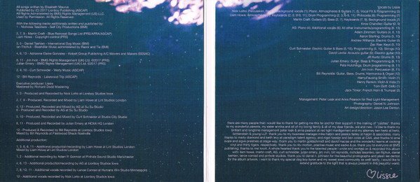 ℗ & © 2018 Lionboy Records under exclusive license to Cooking Vinyl Limited. (On CD label) ℗ & © 2018 Lionboy Records under exclusive license to Cooking Vinyl Limited. Made in the EU (On back cover) Housed in a gatefold digisleeve - no booklet included; no track durations stated on this release sold by Lissie Store Mastered at (by) Richard Dodd Mastering All songs published by (C) 2017 Lionboy Publishing (ASCAP) All Rights administered by BMG Rights Management (US) LLC. Additional publishers: track 1: Self City Productions (BMI) tracks 2, 7, 9: Blue Raincoat Songs Ltd (PRS/APRA/ASCAP) & Copyright control (PRS) tracks 3, 5; International Dog Music (BMI) & Bearkiller Music administered by Razor and Tie (BMI) tracks 4, 6, 13: Kobalt Group Publishing A/C Movers and Makers (SESAC) tracks 8, 11: BMG Rights Management (UK) Ltd. ©2017 (PRS) tracks 2, 4, 10; Werty Music (ASCAP) track 12: Lakewood Trip (ASCAP) Some releases have a black circular sticker with white text on the shrinkwrap: "Lissie Castles includes the tracks 'Best Days' and 'Blood & Muscle'"
