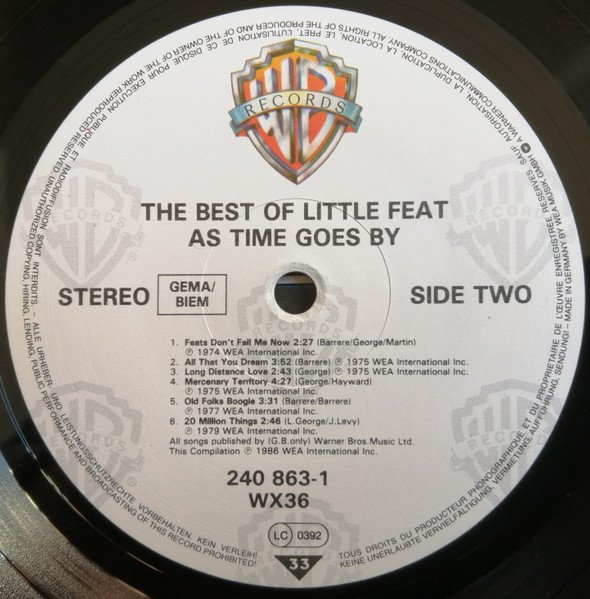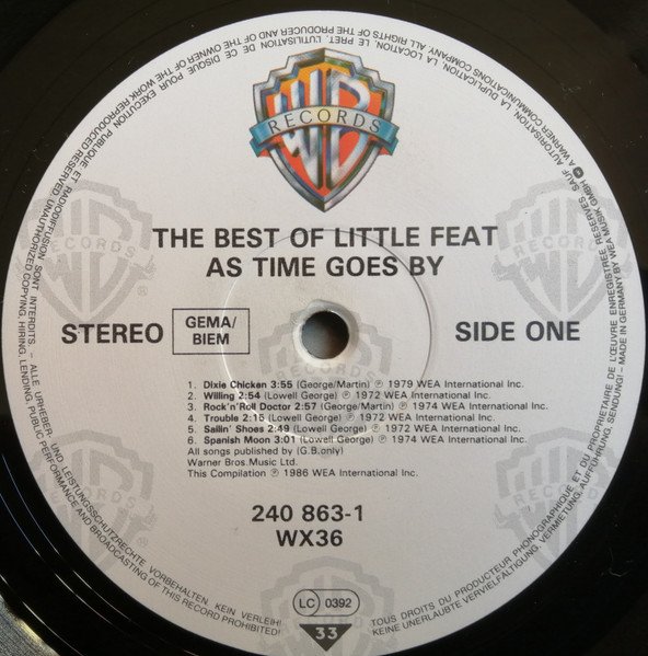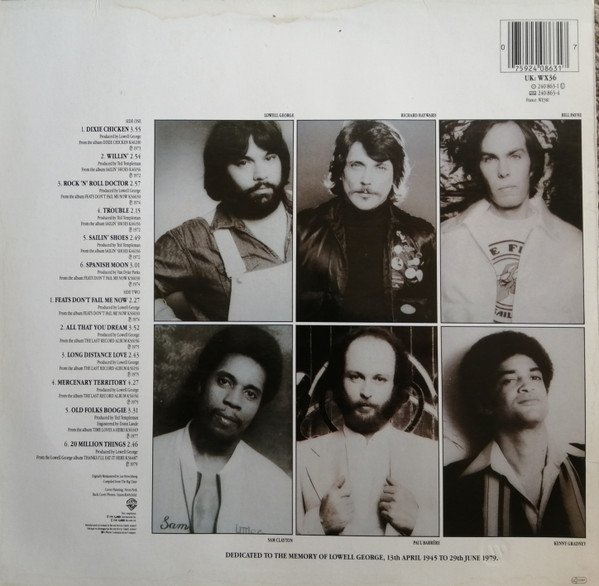 Back cover: Dedicated to the memory of Lowell George, 13th April 1945 to 29th June 1979. Compiled from The Big Chair This compilation: ℗ 1986 WEA International Inc. © 1986 WEA Records Ltd. Manufactured in Germany by Record Service GmbH, Alsdorf Embossed Warner Bros. logo Labels: All songs published by (G.B. only) Warner Bros. Music Ltd. This Compilation ℗ 1986 WEA International Inc. Made in Germany by WEA Musik GmbH Stamped runout till ...1 A / ...1 B, all after etched