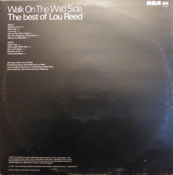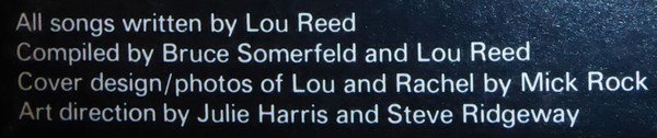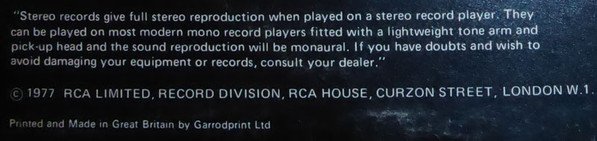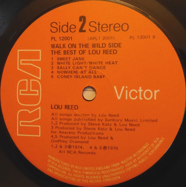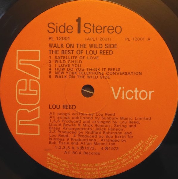 This is the first pressing, with orange labels and printed inner sleeve advertising some of Lou's other RCA LPs (but omitting Metal Machine Music). On Back cover: © 1977 RCA Limited On labels: Manufactured by RCA Limited, England from master recordings A4 Produced for Nimbus 9 Productions B3 Produced for Anxiety Productions
