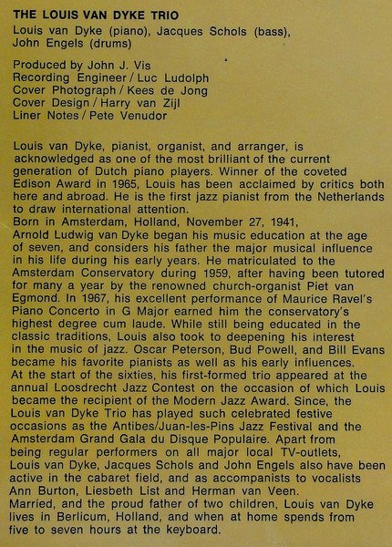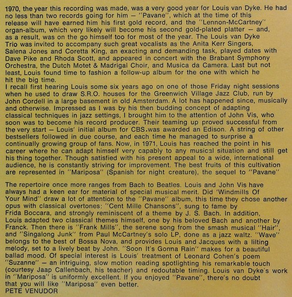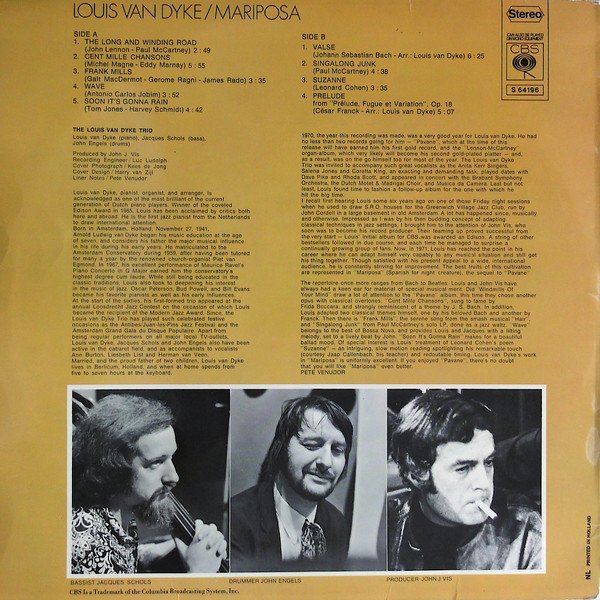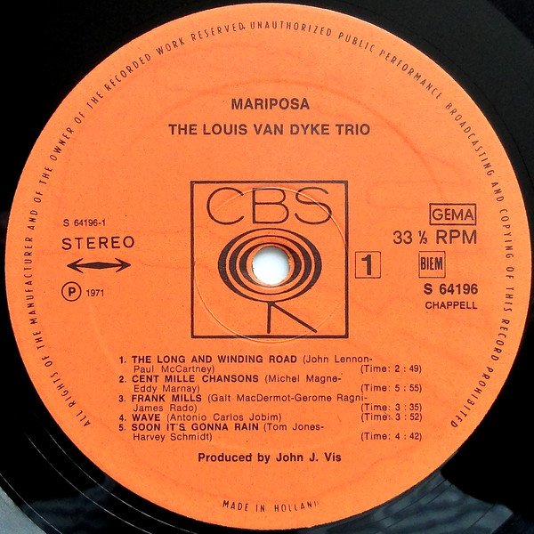 on spine: CBS S 64196 Louis Van Dyke ● Mariposa ● sleeve: NL Printed in Holland labels: ℗ 1971 Made in Holland Main artist name on sleeve: Louis Van Dyke Main artist name on label: The Louis Van Dyke Trio