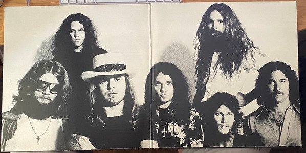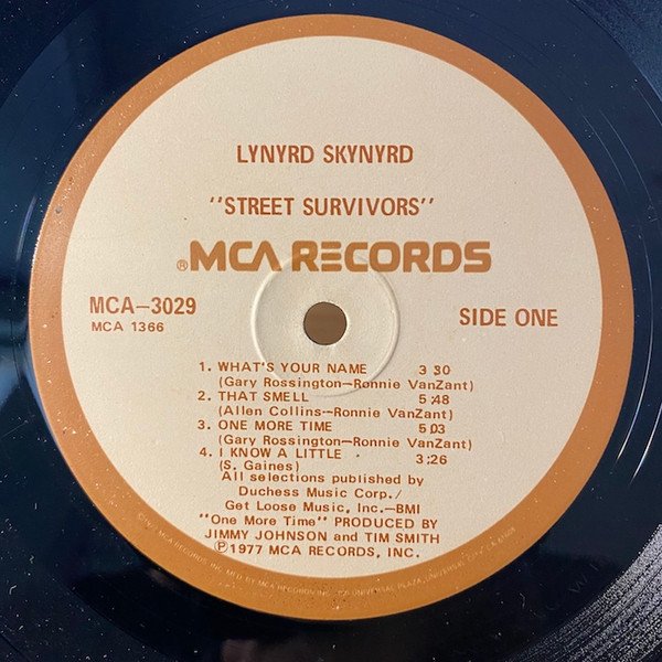 This release does not have "MASTERED BY CAPITOL" in runouts. [l=MCA Pressing Plant, Gloversville] pressing denoted by ⧈-G-⧈ stamp in runouts. 1978 repressing with tan labels that have a brown solid perimeter band. The album includes an insert that is a composite of one side from each of the two inserts that came with original pressings. One side includes the track list and credits. On the original insert this information was backed with the tour dates. The other side is a merchandise promo offer for items for sale, and includes information about, and requests for donations for the Ronnie Van Zant / Steve Gaines Foundation "For the benefit and education..." for their daughter's education, and an additional request for a music scholarship fund set up "on behalf of Steve and Cassie Gaines..." to support students at Northeastern Oklahoma A & M Arts and Music College. The original insert had a questionnaire about which previous Lynyrd Skynyrd LPs the purchaser already had on the reverse. The wording on the merchandise promotional offer side was also altered. The original had "LYNYRD SKYNYRD - SURVIVAL KIT" and the reissue version (seen here) had dropped "SURVIVAL KIT". An original insert can be viewed at: [r5238748]. This is a reissue, the previous release had different jacket artwork with flames for background on the front cover that was removed after the tragic accident. The new front cover image is a blow-up of the group shot that appeared on the back cover of the original pressing. The reissue version has replaced that back image with a track list. The record has an MCA sleeve with trade mark information along the bottom edge. (see image) ℗ © 1977 MCA Records, Inc.