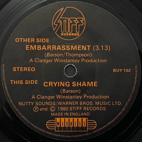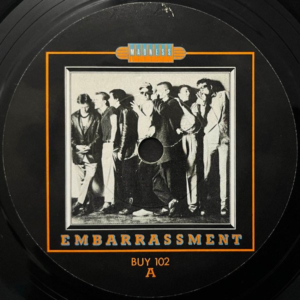Black picture labelled edition very similar to the [url=http://www.discogs.com/Madness-Embarrassment/release/401157]non Lyntone pressing[/url]. The black vinyl may appear translucent pale red when held in front of a light. Made in England