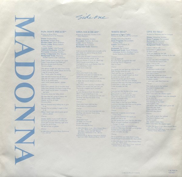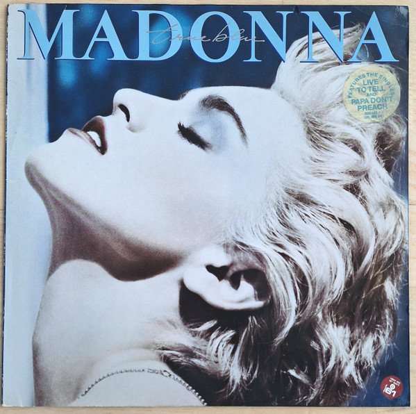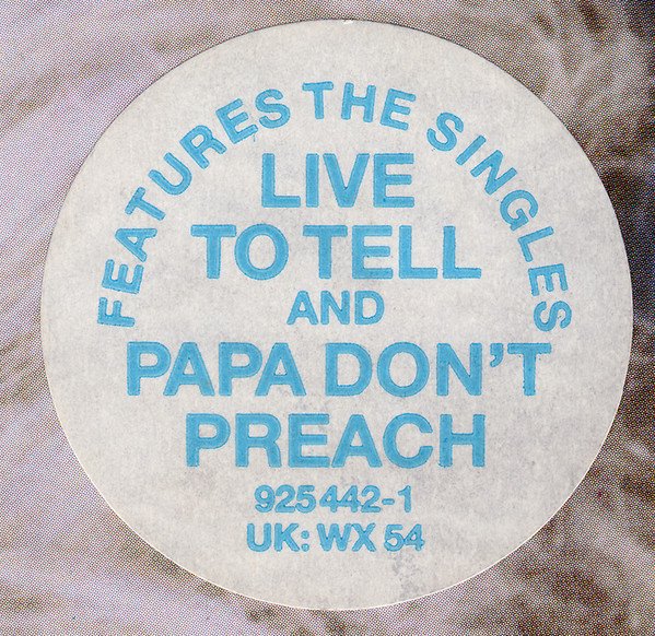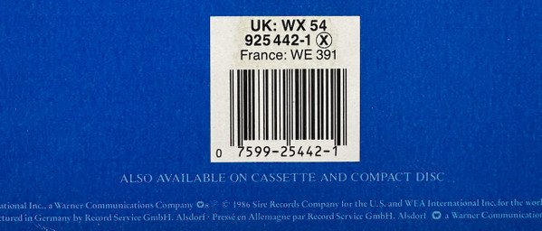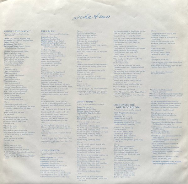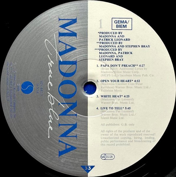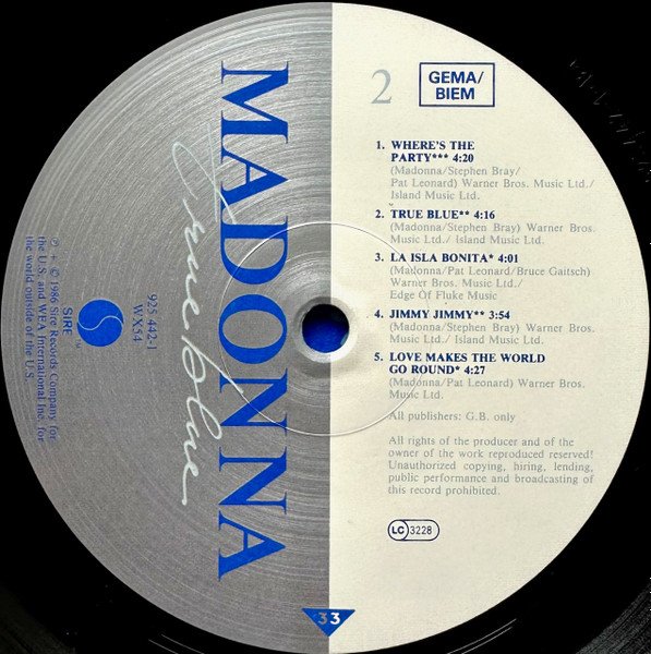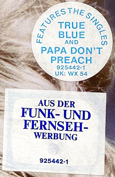 This European pressing of the album was released with advertising stickers in several variations, but all round and white. All versions included an inner sleeve with lyrics and credits. The label used was not the standard yellow-orange Sire label but a custom-made one for this album. Some copies issued in France came with an [url=https://www.discogs.com/Madonna-True-Blue/release/162682#images/32529655]obi featuring a list, in French, of all the countries where the album charted at number 1[/url]. Later pressings (1987) were released with a free giant souvenir poster from the "Who's That Girl World Tour". The presence of this poster is advertised with a round purple sticker. The edition including the poster is listed separately: [r=2227018]. Lacquer cut at Future Disc which can be identified inside the runout groove. Record Service Alsdorf used US sons (stampers) - manufactured by Allied Record Company (ARC) - to press them in Germany. 'Metalwork' / 'plating' (fathers and mothers) were made at Sheffield Lab Matrix as subcontractor for the ARC – identified by 'delta' numbers ("△ #####" and "△ #####-X") along with a "-SH#" and the [Allied 'ɑ' logo]-stamp along with the manufacturer matrix numbers B-#####. Labels: Track A1 published by Elliot Music Corp. (MCPS Ltd.)/Jacobsen Music Pub. Co. Track A2 published by Warner Bros. Music Ltd./Ralfelson Music Tracks A3, B5 published by Warner Bros. Music Ltd. Tracks A4, B1, B2, B4 published by Warner Bros. Music Ltd./Island Music Ltd. Track B3 published by Warner Bros. Music Ltd./Edge Of Fluke Music All publishers: G.B. only. Insert: Track A1 © 1986 Elliot/Jacobsen Music Publishing Co. ASCAP. Track A2 © 1986 WB Music Corp./Bleu Disque Music Co., Inc./Webo Girl Administered by WB Music Corp. ASCAP/Warner-Tamerlane Publishing Corp./Bertus Publishing Administered by Warner-Tamerlane Publishing Corp. BMI/Ralfelson Music ASCAP. Tracks A3, A4 and B5 © 1986 WB Music Corp./Bleu Disque Music Co., Inc./Webo Girl Administered by WB Music Corp. ASCAP/Johnny Yuma Music BMI. Track B1 © 1986 WB Music Corp./Bleu Disque Music Co., Inc./Webo Girl Administered by WB Music Corp./Black Lion Music, Inc. ASCAP/Johnny Yuma Music BMI. Tracks B2 and B4 © 1986 WB Music Corp./Bleu Disque Music Co., Inc./Webo Girl Administered by WB Music Corp./Black Lion Music, Inc. ASCAP. Track B3 © 1986 WB Music Corp./Bleu Disque Music Co., Inc./Webo Girl Administered by WB Music Corp. ASCAP/Johnny Yuma Music BMI/Edge Of Fluke Music ASCAP. "White Heat": Dedicated to [url=https://www.discogs.com/artist/1563069-James-Cagney]Jimmy Cagney[/url]. This album was recorded at Channel Recording and mixed at Master Control. Originally mastered at Future Disc. Paulinho da Costa appears courtesy of Pablo Records. Siedah Garrett appears courtesy of Qwest Records. Jackie Jackson appears courtesy of Epic Records. Paul Jackson, Jr. appears courtesy of Mankind Productions. Yamaha equipment appears courtesy of Doug Buttleman. This album is dedicated to my husband, the coolest guy in the universe. Marketed by WEA International Inc., a Warner Communications Company. ℗ + © 1986 Sire Records Company for the U.S. and WEA International Inc. for the world outside of the U.S. Manufactured in Germany by Record Service GmbH, Alsdorf. A Warner Communications Company For the German market, some copies come from the Bertelsmann Music Group with a sticker: "13188 8 Club Edition" Runouts: - Stamped: [Allied 'ɑ' logo], R/S Alsdorf 925442-1-A and the following number (in some variants), R/S Alsdorf 925442-1-B and the following number (in some variants) - Etched: everything else - On variant 16, side B runout, 64 is etched over GER