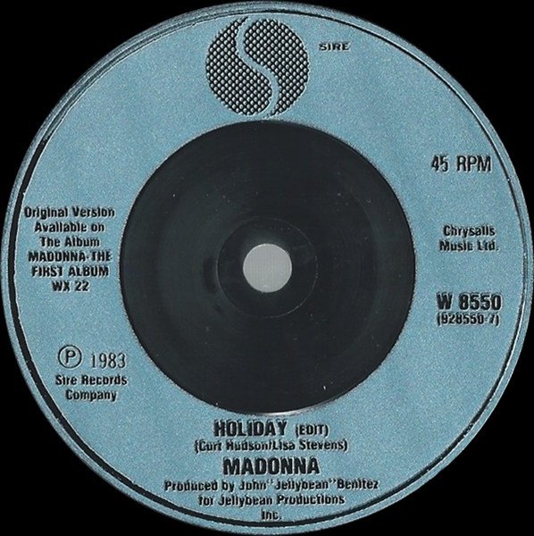Silver injection-print labels on vinyl. In matt paper sleeve, full-color both sides. A-side ℗1986. From the album True Blue WX 54. B-side ℗1983. Original Version Available on The Album Madonna - The First Album WX 22.