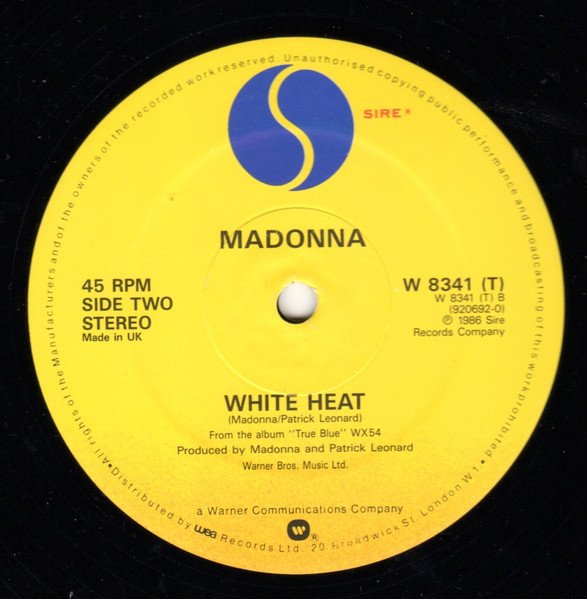 This release comes with no-squared opening sleeve and differs from same cat# that[url=https://www.discogs.com/release/549727] has this facilty.[/url] Another similar looking UK 12" edition ([r1887898]), released simultaneously with this one, has an additional track on B, "Who's That Girl (Dub)". On rear sleeve A. Side Original version from the forthcoming Original Motion Picture Soundtrack Album 'Who's That Girl' (WX 102, WX 102C, 925 611-2) On rear sleeve B. Side From the Album 'True Blue' (WX 54, WX 54C, 925 442-2) On label A: Original version available on the album "Who's That Girl O.S.T." WX102 [r518148] ℗ 1987 Sire Records Company. Warner Bros. Music Ltd. On label B: From the album "True Blue" WX54 [r162682] ℗ 1986 Sire Records Company. Warner Bros. Music Ltd. Glossy cover ℗ © 1987 Sire Records Company